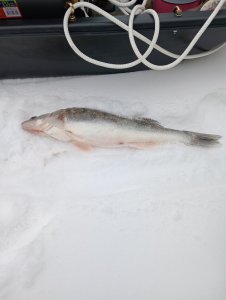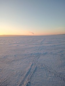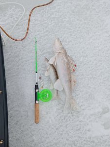 На другой день уже снаряжаю синий прыщь, десантируюсь за звездой и в путь. Бегал за Тань Вань, туда сюда, и все в пустую. добравшись в очередной раз до острова решаю двигаться в сторону Бердской косы. На пол пути чувствую что под ногами что то не так, смотрю а оставшиеся мои следы заполнило водой, решаю ну его идти далее к своей цели и разворачиваюсь обратно. Так пробегал я почти до трех часов, пока не встретил пожилого рыбака. Прохожу мимо него, а он мне и говорит, " не устал еще круги нарезать ?", пообщавшись с ним выясняю, что ловят судачка 2 кучки рыбаков. Ну думаю день прошел и не одной поклевки, фиг с моими принципами пойду к одной и кучки рыбаков. Не доходя до них метров 20 бурюсь. Кунаю прыща и через минут 20, чувствую что то повисло на крючке, и это оказался первый в моей жизни судак пойманный со льда весом 900гр. Затем еще через минут 30 удар, вытаскиваю, а там голова с зубами, да так заглотил, что кровью весь лед залил пока его снимал, выбрасывать и как бы отпускать не стал, все-равно он не жилец. Вторник начал от моста БЗ, народ ловил, а я тупо смотрел на них нет конечно один раз придавило блесну, так конкретно, но засечь ничего не удалось. Сегодня в среду двигаю опять в те края, добираюсь до места к 8 часам, Забуриваюсь и начинаю процесс. Спустя какое то время чувствую удар по блесне, НО все мимо, сижу далее. У ТЭЦ нарисовалась кучка рыбаков, но мое эго мне говорит сиди тут, и я как послушный остаюсь на месте. Проходит пол часика звонок по работе, беру трубу в одну руку, другой продолжаю блеснить, и тут удар, подсекаю, есть. В этот раз засек настоящего бойца, как он упирался, тяну его, а у самого мысли, хорошо что не взял удильник с леской 0.16, а снарядил на 0.26. Спустя пары минут борьбы красавчик весом в 1кг оказался в моих санях, Ну собственно на этом моя разминка и закончилась, Сегодня закупил мотыля, а завтра с утра шурую за чебаком на БЗ, надеюсь надежды оправдаются.