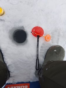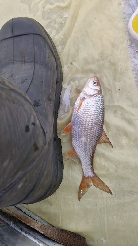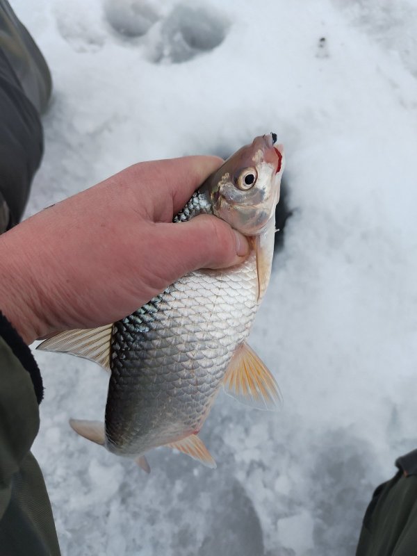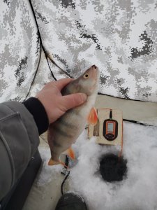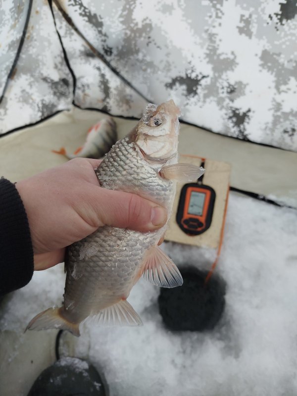 Приехал сегодня в Бердск, оделся и потопал куда глаза глядят. Шёл шёл и приглянулось мне место недалеко от палаток. Там торчали з веточки и какой-то жёлтый, листок или скотч. Присел рядом пробурил пару лунок и накинул палатку, ветер буран. Сразу поймал подлеца а после сорогу резмер 🔥. Потом клевало подходами, но рыбалкой доволен. Глубина метров 8