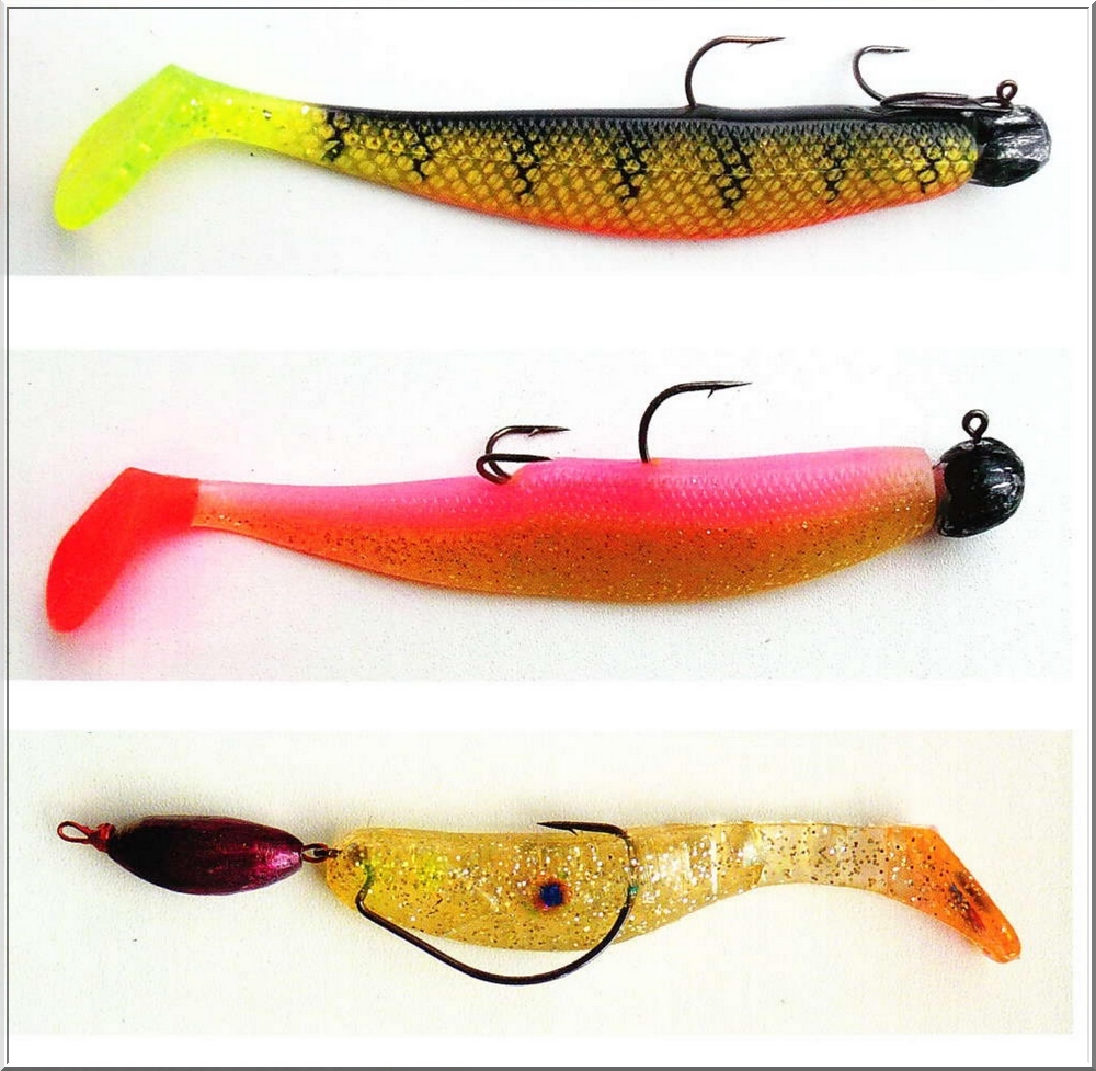 Осенью, при ловле на джиг, судак и щука очень часто лучше ловятся на крупные силиконовые приманки с активной игрой, то есть на виброхвосты, и лично я отдаю предпочтение именно им, а для джиг-дорожки — это однозначно лучший вариант. Большая пятка-лопасть виброхвоста активно играет, и ее вибрации, вкупе с движениями тела, уже сами по себе достаточно привлекают хищника даже при равномерной проводке, а большие размеры приманки дополнительно стимулируют объект нашей ловли на решительную и уверенную поклевку. Подведя итог, можно сказать, что одной из лучших приманок для джиг-дорожки можно считать крупный виброхвост, и остаётся только подобрать правильный вес груза, а также его форму.