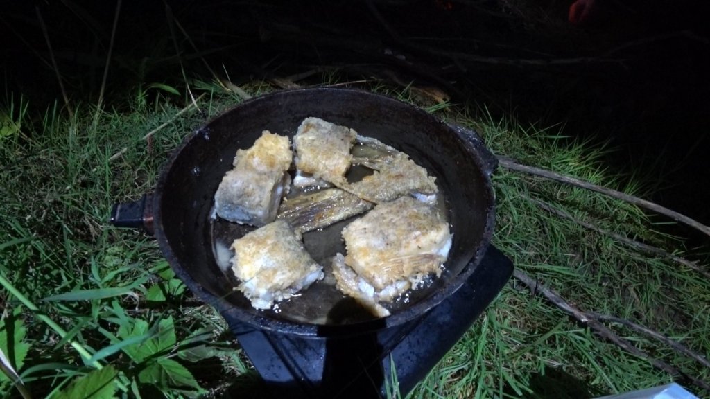 До вечера нам удалось поймать трех щук: одну на килограмм и двух поменьше - отличный результат для ужина! Вернулись, разбили лагерь, поставили палатку и нажарили свежайшей щуки на ужин.