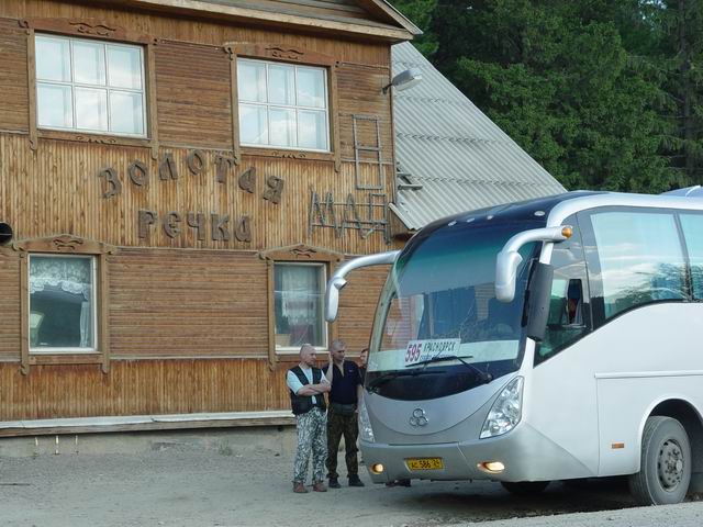 16.08. С утра встаем рано, пьем чай, собираемся и на 2-х такси выезжаем на автовокзал, по пути завезя ключи от квартиры на фирму. За ночь на четверых отдали 1700, что вполне приемлемо. Посадка в автобус, и нас ждет 14-часовая поездка до Северо-Енисейска. Автобус китайский, но относительно новый, называется “SHUCHI-BUS”, что можно перевести как «Щучий-Бас». Через 300 км пути перед паромом в Енисейске обед – в числе первых мчимся в кафешку, заказываем солянку и манты, вместо которых нам приносят плов – но все вполне съедобно и даже вкусно, так что мы не в обиде. Дальше паромная переправа через Енисей и еще 300 км пути, но уже не по асфальту, а по гравийке различной степени раздолбанности. Шофера включают DVD и ставят «Особенности национальной охоты», а следом «Особенности национальной рыбалки», но плеер иногда подтормаживает из-за тряски.