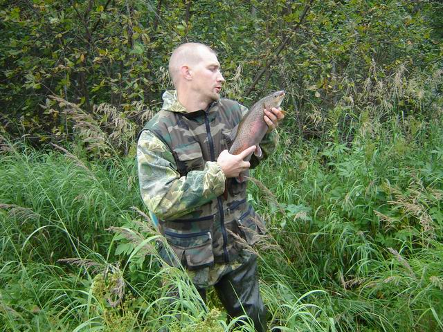 Отобедав и ощипав птичек, собираемся и с чувством благодарности к хозяину приютившей нас избы отплываем. Вода упала сантиметров на 30, но еще высокая, и стала заметно прозрачнее, но приобрела бурый оттенок, из-за болотного торфа. По дороге пытаемся снова догнать уток, которые сбиваются в стаи, но безуспешно. Поскольку вода посветлела, то прямо с борта катамарана начинаем кидать блесны – а вдоль берега почти везде плещется рыба, это кормится мелкий хариус. И вот на одном из плесов брат сообщает, что у него поклевка, а спустя мгновение добавляет, что рыба для лайтовой палки очень серьезная и неплохо бы брать ее с берега. Ага, а мы тут посреди реки расслабились, да и течение тащит так славно. Понемногу подгребаем к берегу, а там полузатопленные кусты. Но деваться некуда, и пару минут мы с ним, чертыхаясь, бегаем по колено в воде с непонятным нечто на том конце лески. А старший брат все это умудряется снять на видео. Но, в конце концов, рыба устает, у берега видим, что это приличный ленок, не меньше моего первого. Я таки хватаю его под жабры и подаю брату, тот, довольный как слон, позирует с трофеем.