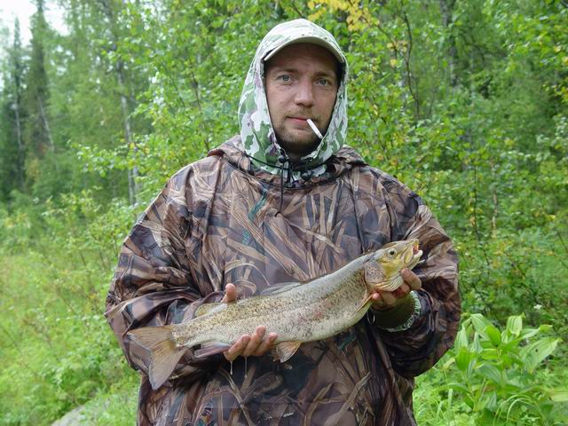 К обеду разъяснилось, и голод заставляет нас тормознуться на острове, где на газовой плитке мы вскипятили воды и заварили бич-пакеты и чай. Для отгона мошки развожу небольшой костерок (газовая горелка рулит для растопки). Плывем дальше, и на подходе к устью крупного правого притока начинает моросить дождь. В устье натоптаны явно рыбацкие тропки, но течение в притоке слишком быстрое, да и глубины нет – в общем, и здесь забросы безрезультатны. Чуть ниже опять останавливаемся – вроде, небольшая ямка среди камней. Мужики пытаются кидать, а я иду ниже, в поворот реки. Здесь явное сужение русла, много камней, а чуть ниже вполне себе выраженный порожек с двумя крупными сливами и несколькими помельче. Фактически, шивера, но перепад воды в главном сливе больше полметра. Перед порогом каменистый участок с чуть более тихим течением воды, кидаю туда блесенку, и ощущаю небольшие удары: на зацепы от камней непохоже, скорее всего, долбит мелочь. Это значит, что рыба таки есть! Иду к парням и зову их покидать на мое место (они кучкуются метрах в 400 выше по течению). Сам спускаюсь под главный слив, кидаю, и со второй или третьей проводки вытаскиваю хайрюзка грамм на 300. Ну, слава Богу, есть рыба! Тем временем, коллеги по цеху рассредоточиваются вдоль порога – и тут поперло! Несмотря на моросящий холодный дождь, рыбу начинают с переменным успехом доставать все. В основном, это некрупный, грамм по 200-300 хариус, однако я вытаскиваю одного явно на полкило, есть чуть меньшие, грамм по 400. В один из забросов в дальний угол порога ощущаю уверенную поклевку, начинаю подтаскивать рыбу, вначале она идет легко (у меня палка достаточно дубовая), но ближе к берегу сопротивление рыбы резко возрастает. Вижу сквозь пенистую воду, что это или очень крупный хариус, или ленок, мне на помощь приходит брат, и в прибрежных камнях он берет за жабры рыбину и выносит на берег, и тут я, слегка при***ев, вижу, что это недурственный такой ленок, килограмма на полтора и длиной в полметра. Сбегаемся полюбоваться рыбиной, а я сажусь на мокрые камушки и закуриваю, переживая добычу трофея. Разумеется, последующие забросы в то место безрезультатны.