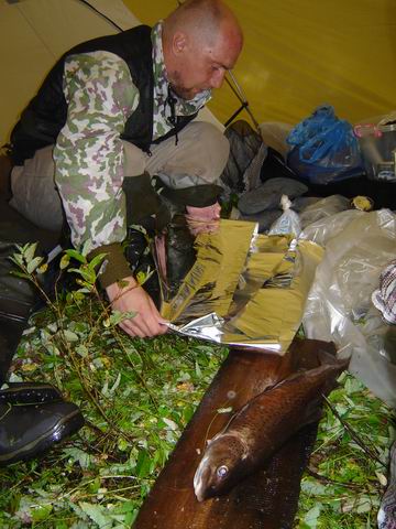 В любом случае, на сегодня рыбалка более чем удалась, а значит - поездка состоялась! Это главное, но теперь необходимо утилизировать (читай – приготовить и сожрать!) добычу. Принимаем решение: сделать хорошую, добротную двойную уху из хариусов, самых крупных пустить на согудай, а ленка запечь в фольге. Благо, старшие товарищи, несмотря на проливной дождь, развели таки добротный костер. Мы ж с младшим братом идем чистить рыбу, а затем отделять филе хариуса. Закончив с этим, я прячусь от дождя в палатку и сначала заряжаю мариноваться согудай, затем запечатываю с пряностями в фольгу ленка. Кстати, рыбка потянула на 1,8 кг – очень неплохой результат, хотя мы ловили и крупнее.