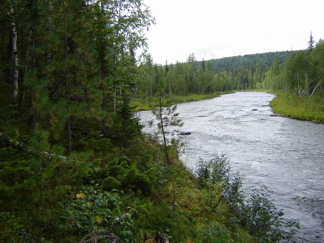 24.08. Встаем по гидробудильнику, т.е., кто когда; и сразу после завтрака (остатки рыбы, чай, печенье и сухарики со сгущенкой) начинаем собираться: сегодня обязательно надо проплыть хороший кусок, а завтра в обед быть в деревне, до которой остается больше 20 км. К обеду выплываем. Пробуем прокидывать вчерашнее место и ловим 1 хариуса, потом едем дальше. По дороге впереди на воде стайка уток, подгребаем к ним (пока они не слетают, их можно догнать на воде), брат стреляет дважды или трижды, одну утку удается взять, а остальные либо заныривают, либо разбегаются, и неясно, есть ли среди них подранки. С воды в глубоких местах продолжаем кидать спиннинг, и эта тактика тоже небезуспешна: за день удалось взять 5 рыбин – это средненькие хариусы и небольшие, до полукилограмма, ленки. Откровенную мелочь (а на блесну кидались и 10-сантиметровые хайрюзки) выпускаем. Подъехали к ручью в месте резкого поворота реки, под перекатом роскошная яма – но заметно, что место посещаемое. Тем не менее, старший брат наконец-то ловит леночка на полкило, а я – хорошего хариуса. Приезжаем к устью крупного левого притока – и видим у одного берега лодку с рыбаками, а чуть позже – и у другого. Народ ловит длинными удилищами – либо на мокрую муху, либо на «балду». Держимся от них подальше, чтоб не терять время. После впадения притока река становится еще шире, а посредине отличная длинная яма. Кидаем спиннинги, у брата поклевка, он вынимает мелкого – грамм 150 – ленка и отпускает его. Все это происходит в полусотне метров от стоящей у берега лодки с четырьмя рыбаками. Они, видя такое дело, после длинной молчаливой паузы отпускают нас подальше, а затем видим уже позади себя, как они заводят мотор и становятся на якорь на это место. Ну, удачи. Мы же уходим за пологий поворот, пристаем к берегу и прокидываем очередной слив, где я на зацепе обрываю очередную блесну. Ну, у настоящих спиннингистов об оторванных блеснах жалеть не принято, пусть это будет даже самодельная 20-граммовая колебалка, собственноручно выкованная из серебра! Пока мужики кидают, вижу нечто темное, плывущее по течению на поверхности воды. Приглядевшись, вижу, что это дохлая утка – видимо, умерший из обстрелянных нами подранков. Прыгаем на катамаран, а брат бежит вдоль берега, пытаясь подобрать ее на мелководье. Но метров через 300 мы настигаем ее на воде – и точно, утка, засунула голову под крыло и издохла от потери крови. Две утки – не одна, и это уже серьезная заявка на ужин (хотя здешние гоголи совсем мелкие, чуть покрупнее рябчика).