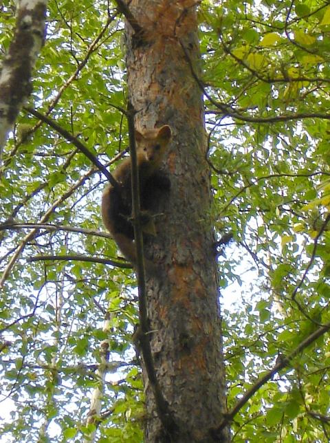 Сплыв еще километров 6-7, начинаем присматривать место для ночлега. По правому берегу мы видели пару избушек, но обе были небольшие и явно не в лучшем состоянии. Я предполагал провести последнюю ночь на острове неподалеку от деревни, причем остров подобрать так, чтобы одна из проток была явно неходовая – ни к чему стоять у фарватера и привлекать местных. Первый островок нам не подошел – низкий и открытый. Ниже пытаемся подобрать место в лесу на терраске – я иду на разведку, следом Алексей. Иду вдоль бровки берега, по звериной тропке. Вдруг слышу шорох, а затем тихое недовольное урчание, и на сосне шагах в 10 перед собой замечаю соболя. Это довольно крупный кот, но на совсем взрослого не похож – наверное, второлеток. Шкурка у него еще короткая, летняя. Чуть поднявшись по сосне, зверек начинает меня разглядывать, а я любуюсь на него. Тихонько подзываю Алексея с фотиком, а сам бегу за старшим братом с видеокамерой. Соболек же, чуть взобравшись повыше и почувствовав себя в безопасности, охотно позирует и разглядывает пришельцев.