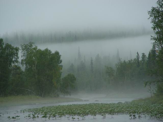 Постепенно в голове созревает план борьбы со стихией. Сплываем чуть пониже и вытаскиваем вещи в лес, на высокую плоскую террасу с густым лесом. Место под палатки находим без особых проблем, но сейчас главное – укрыться от дождя. Натягиваем полиэтилен между деревьев, ставим дополнительные подпорки и растяжки, и сразу становится несколько уютнее, хотя дождь захлестывает с боков. Затем общими усилиями делаем прямо под пленкой (она натянута высоко) костер, куда подкладываем для жара сырую березу, распаковываем вещи и достаем теплые куртки, шапки и перчатки.