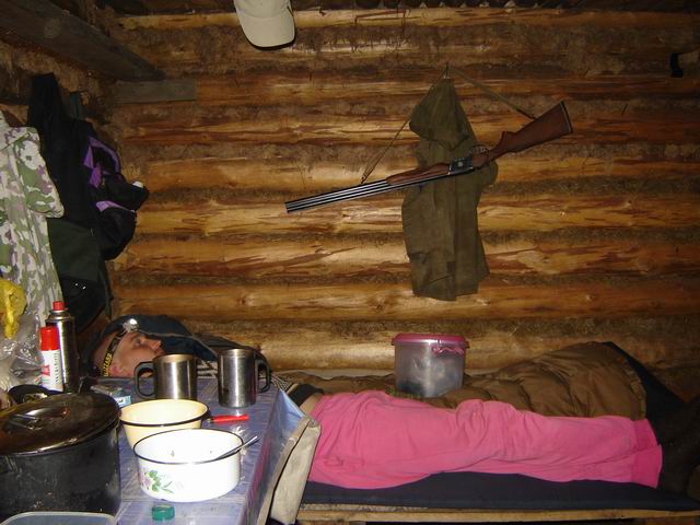 Решаем заночевать под крышей, переносим вещи, катамаран прячем в кусты. Разжигаем печку, она начинает парить. Мужики недоверчиво присматриваются к заброшенной обстановке таежного зимовья и вдыхают затхлый воздух, но мы с братом знаем, что стоит разгореться печке и согреться еде, все будет по-другому.
