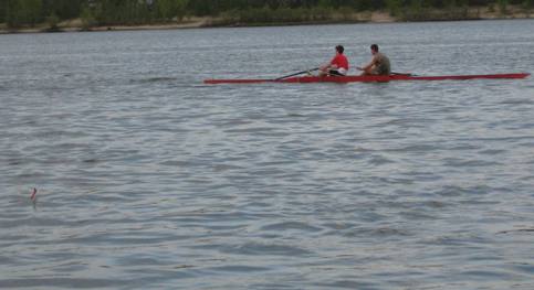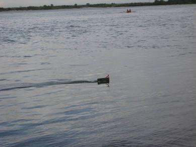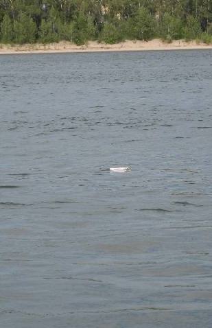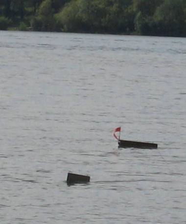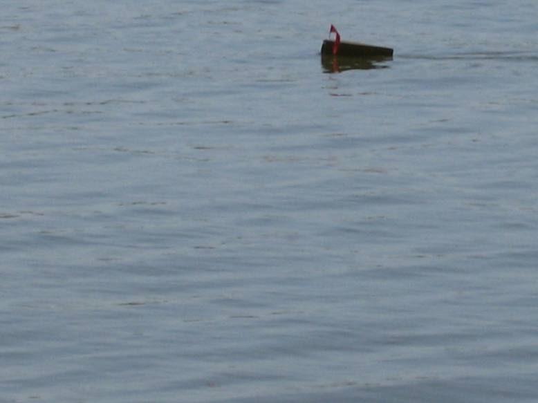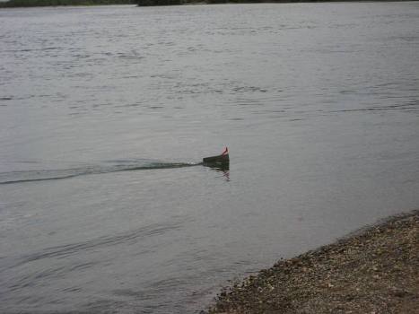 После окончания определения оптимальных размеров путц и положения центра масс, ближе к вечеру мы начали испытания на максимальные нагрузки. В результате этих испытаний на корпусе кораблика появились трещины из-за увеличения нагрузки на него. После ремонта в полевых условиях (в трещины был залит клей ПВА, а сверху наклеен скотч) было принято решение на следующий день продолжать испытания на этих режимах до полного разрушения кораблика. На третий день таких испытаний мы загнали кораблик на такие режимы, что не смогли его вытащить на длине всей буксирной лески (диаметром 0,6 мм, длина 25 м). кораблик погружался под воду и стоял колом. При дальнейшем стравливании лески и шнура кораблик всплывал, но никак не хотел идти к берегу.Рразрушился не кораблик, а оборвался белый шнур, которого на катушке было 100 м. Это произошло при попытке сделать первую площадку для замератяги и угла отхода на дистанции 50 м.Время было уже около восьми вечера, лезть за ним в воду уже не было никакого желания. Течением кораблик занесло в протоку, по которой на лодке плыли два рыбака, которые его нам и вытащили. Повезло. В добавок выяснилось, что в суматохе был утоплен и наш динамометр.