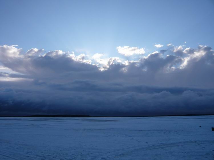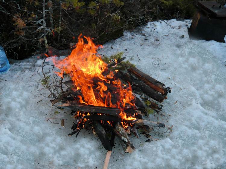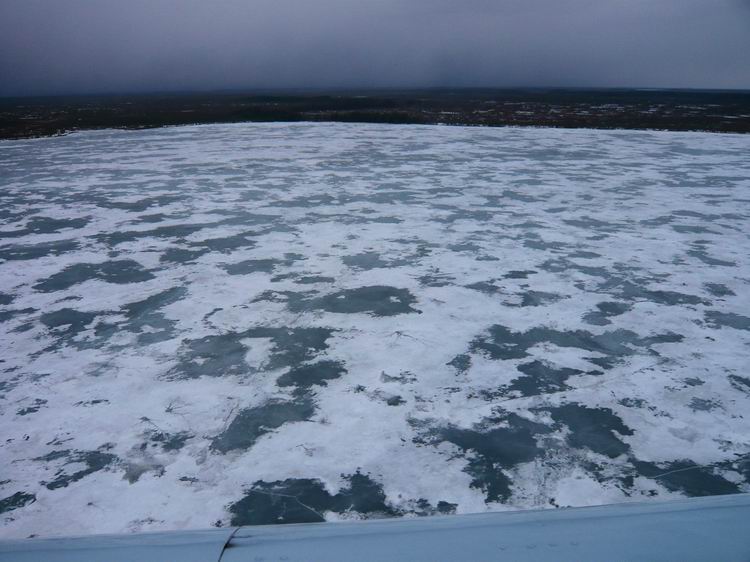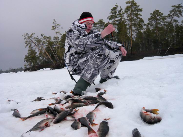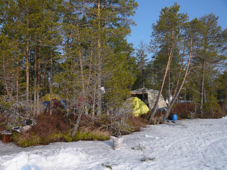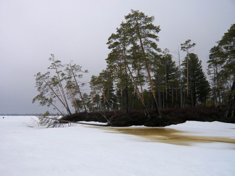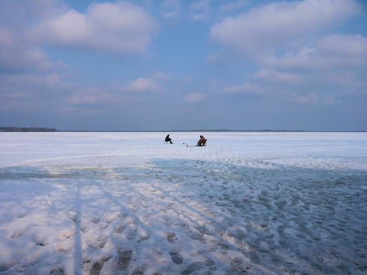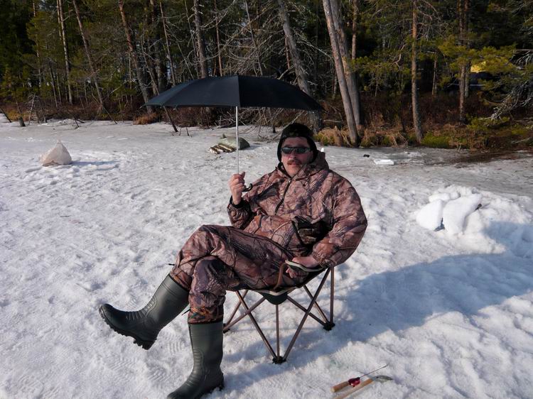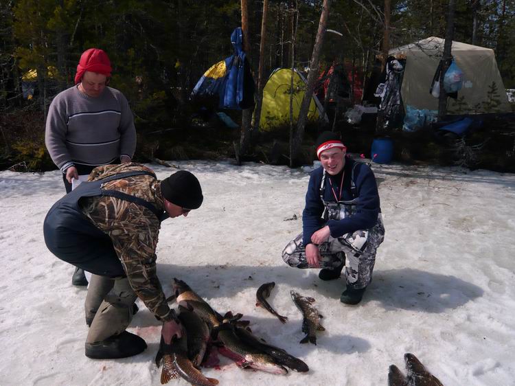 Выгрузив снаряжение, продукты и снегоход из вертолета, потонули в оглушительной тишине. Озеро встретило нас абсолютным безлюдьем. Ни домиков, ни рыбаков, ни человеческих следов. Только таежное безмолвие, редкие крики перелетных гусей, да заливные песни скворцов. Снега нет. Лед почти чистый, без воды, толщина 60-80см. Буриться мотобуром легко))). Разбитый лагерь (зимние палатки с печками) на берегу слегка притонул в болоте. Но тут уж ничего не поделаешь, куда высадили, там и встали. Не успев поставить палатки, самые нетерпеливые в 10 метрах от берега пробурили лунки: не прошло и минуты, как началось…
