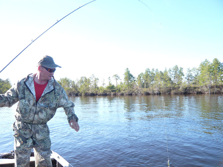 Рыбалка была отработанной. Постоянное пребывание в течение месяца (с небольшими перерывами) на одном и том же озере быстро определило «клевые места». Щука вся у берега до 200 метров, в коряжнике, мелководных заливах, в камыше и на границе его. Окунь может гулять повсюду, но крупный предпочитает глубины 3-5 метров. Как ни странно, но именно на этих глубинах в приповерхностном слое воды полно малька. Его хватает и у берега, но здесь он заметно мельче. Крупный окунь клюет практически на любые приманки: воблеры, вертушки, колебалки. Но особенно эффективен джиг, с обычными «окуневыми» паралонками стандартных размеров.