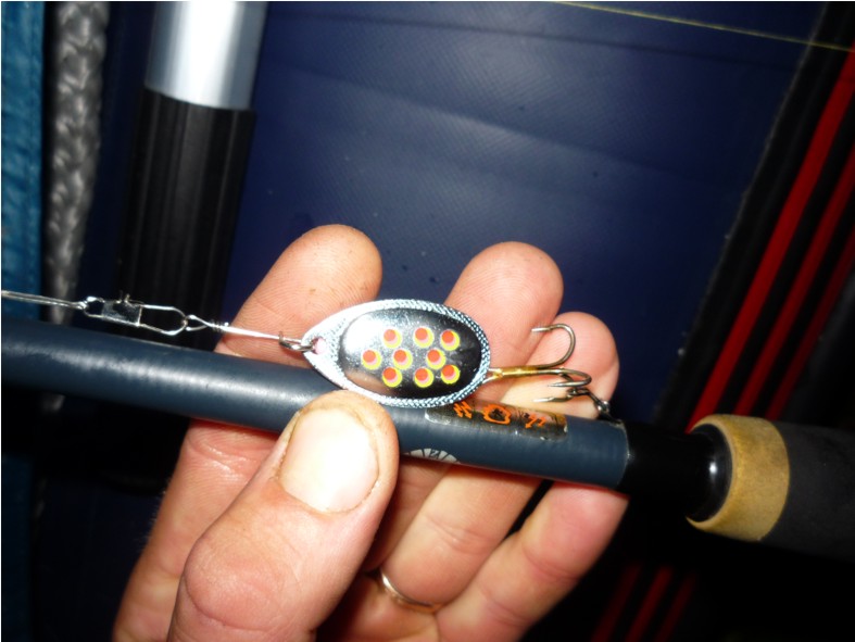 Ловили окуня на различные номера (от 1 до 5) и расцветки блесен, на крупные воблеры до 7-9 см, однако наиболее часто поклевки были именно на серебристые вертушки №2 с голубыми или красными пятнышками.