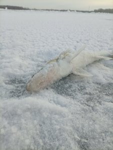 Ставили жерлицы уже на другом озере которое находилось в трех километрах от живцового. Там где ловили живцов тоже раскинули с десяток жерлиц, которые всю рыбалку молчали, лишь единожды порадовав нас каким-то непонятным белым окунем.