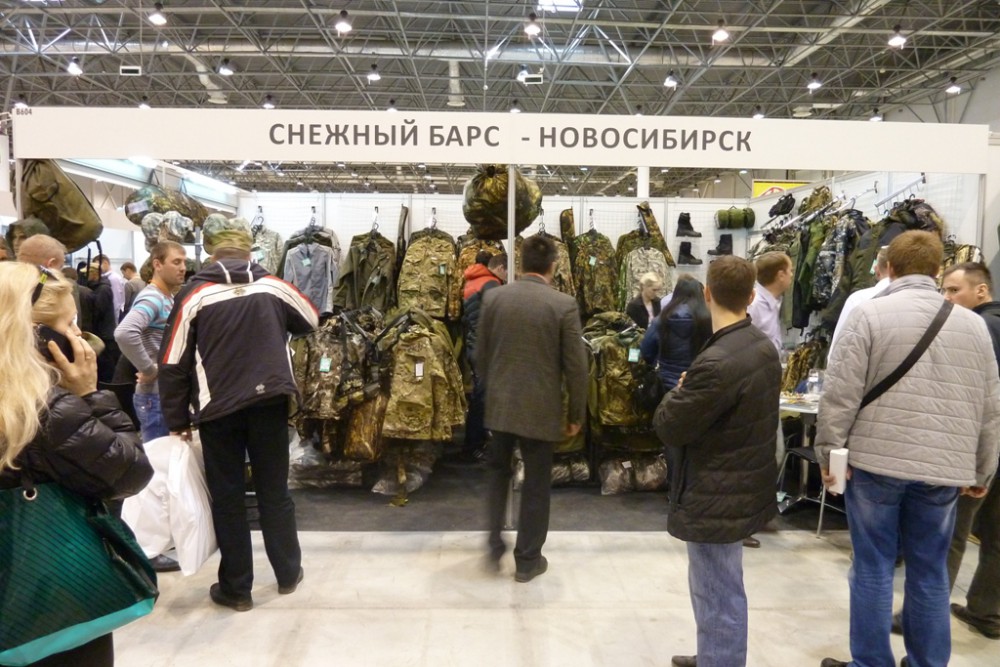 Стенд с одеждой "Снежный Барс". Кстати, здесь вы можете найти костюмы "Dynamics" бердского производства, летние и утепленные.