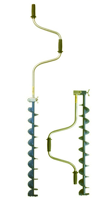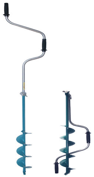 Выпускаются и двуручные ледобуры, у которых верхняя рукоятка смещена относительно его оси. Вращать такой ледобур нужно одновременно двумя руками. Если вы раньше постоянно пользовались классическим ледобуром, то поначалу это может показаться не совсем удобным, но освоив технику сверления, убедитесь, что усилий нужно затрачивать меньше.