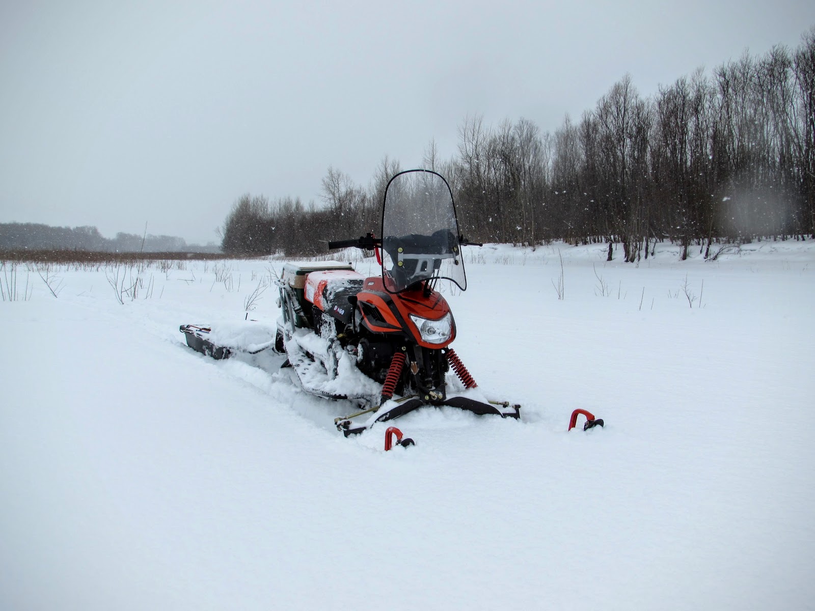 Температуры в районе нуля и свежевыпавшего влажного плотного снега, это ахиллесова пята снегохода. Он сразу скисает. Снег забивает все внутреннее пространство гусеницы, комкуется там. Мощности мотора не достаточно, чтобы прокрутить этот снежный ком. Внутренняя поверхность гусеницы гладкая, в отличие от старших собратьев, которые имеют небольшой протектор и с внутренней стороны, что не способствует очищению от снега. Так что в буран, с околонулевой температурой лучше воздержаться от поездок.