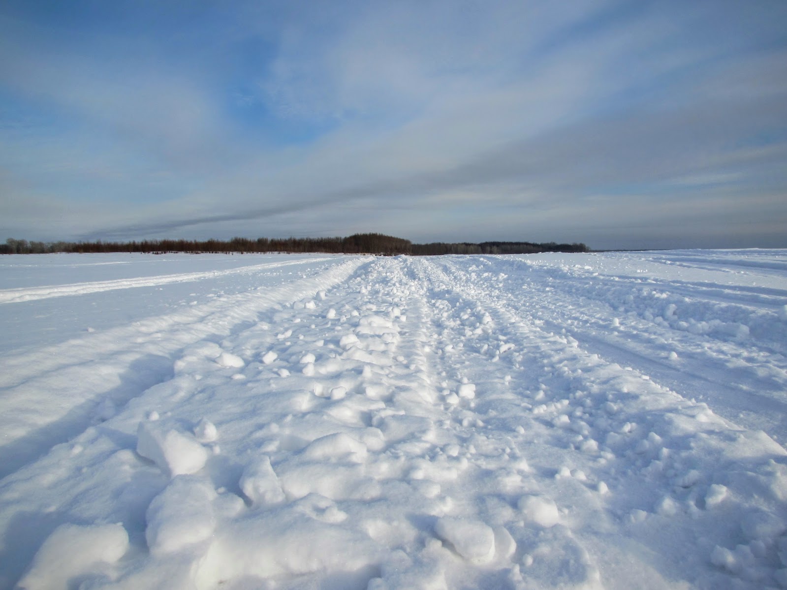 Накатанный след после больших снегоходов, Динго не любит. После них, дорога вся перепаханная,