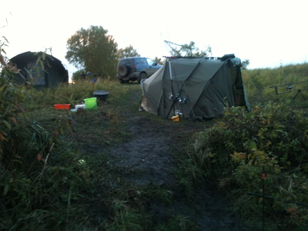 Сектор попался очень удобный с точки зрения быта. Несмотря на то, что половина береговой линии была ограждена кустами, мешающими забросу, в секторе удобно разместились две палатки (для ночлега и для работы) и два родпода.