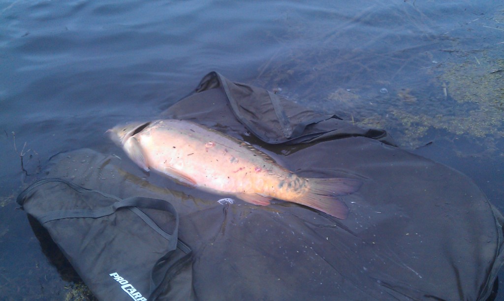 Вобщем минут через 10-15 завожу рыбу в подсак (спасибо за помощь соседу на водоеме)...поднимаю подсак - и вижу этого зверя)))) Кладу на мат, сердце стучит...скорее на весы, поднимаю - стрелка ложится на 9,5кг))))