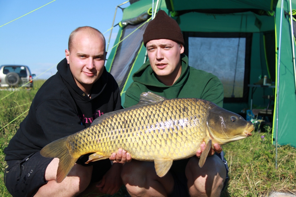 И вот около десяти утра, только мы собрались попить кофе, пикнул сигнализатор – я уже на изготовке, еще один пик и подсечка, непродолжительное вываживание, попытка скрыться в камышах, но уверенные действия Лены и карп в подсаке. Вызываем судей на взвешивание, а в голове лишь одна мысль – ну хоть бы ОН был не легче 5.450… Разница то с командой Кургана 5.440…