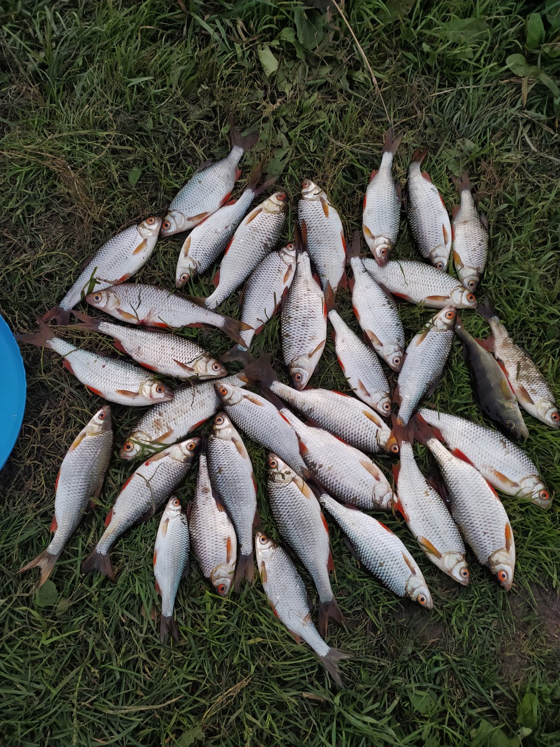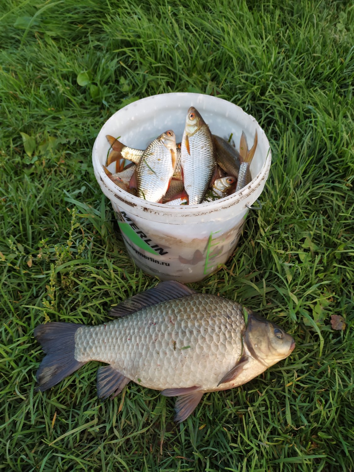 Сегодня дежурил с 9 до 19, остановился посередине озера в кувшинках. С утра и до 12 пару плотвичек, потом дождь... В общем рыба начала кушать после обеда. Плотвы наловил, а как бонус за старание, под вечер взялся красавец карась ?. Прикорм и остальное на фото.