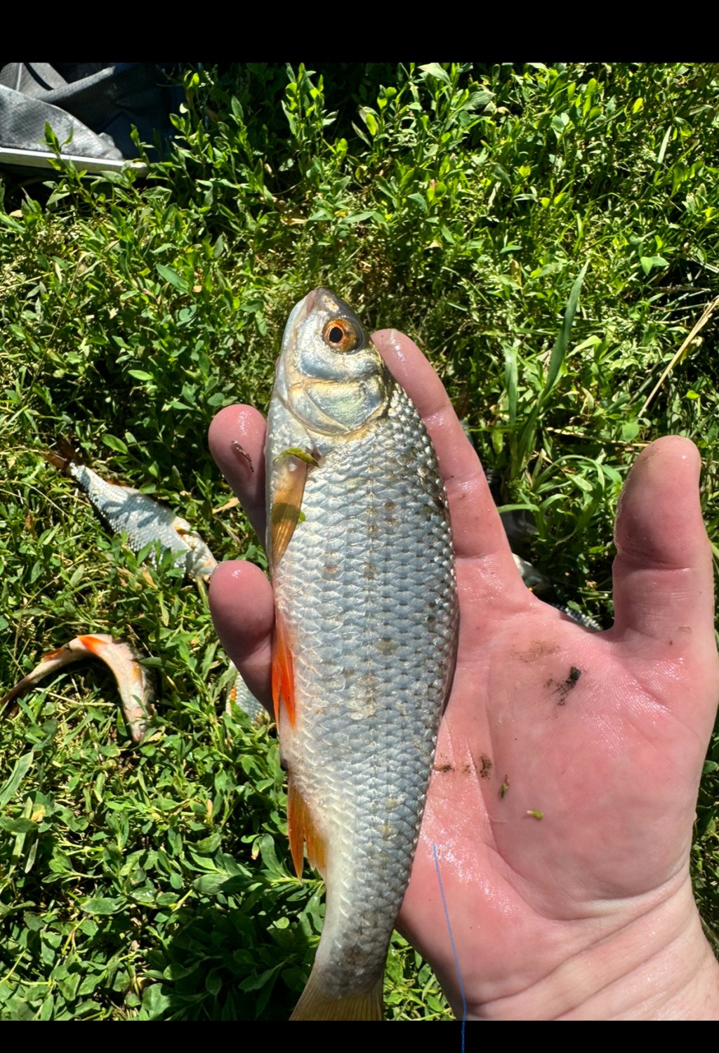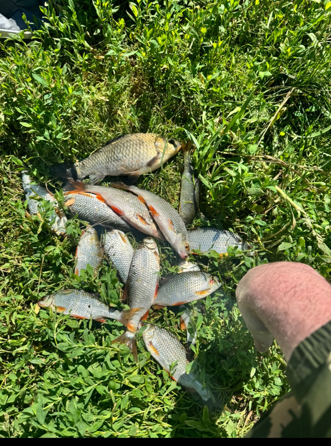 Здравствуйте, сегодня все таки решил выехать порыбачить не смотря на жару, приехал в 6-20, поговорил с Виктором, говорит ловят, доехал до ложки, все окопы почти заняты, нашел одно местечко, замесил прикорм и начал кормить, фидер на карася, поплавок на плотву ну и на карася, на фидер мелкая плотва на все подряд, а на удочку хорошая плотва, на кукурузу, кое- как порыбачил до 11, мошка покоя не дает, жара просто ебей..ая, собрал шмурдяк и в магаз за пивом, жду спада жары, а там за лобиком можно ехать, на фидер поймал одного Карасика на перловку, чем кормил на фото. Итог 14 плотвы и одыН Карасик.
