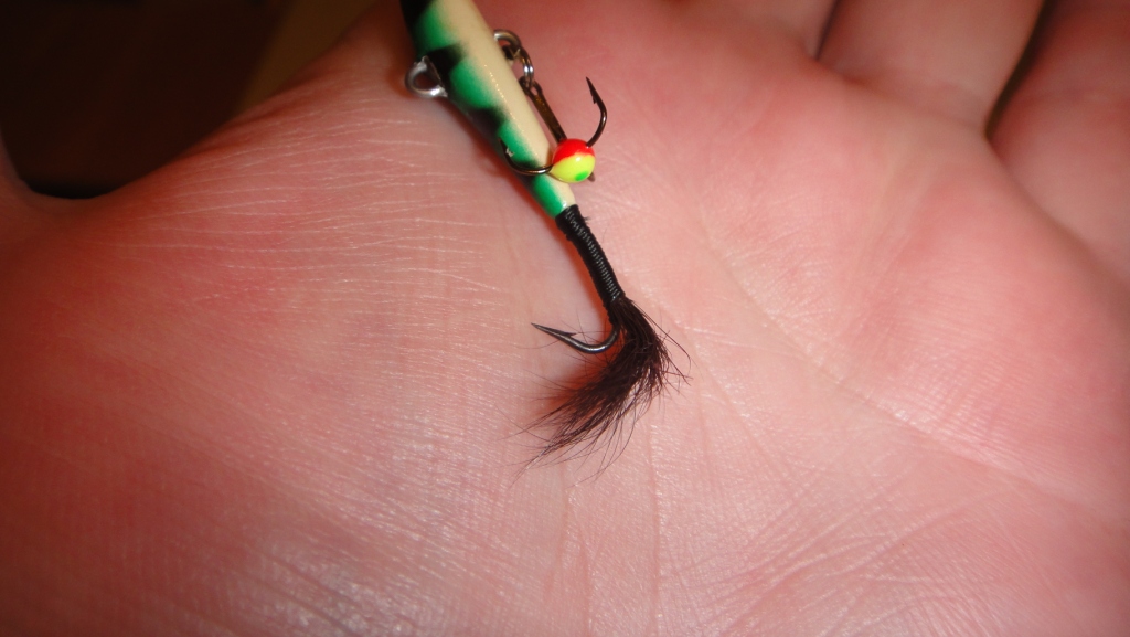 Так же, затрагивая зимнюю тему, хотел спросить, может кто узнает, из какого материала связаны мушки на блеснах, (фотография ниже), очень похоже на перо петуха, но цвета какие-то не реальные и блеск как у синтетического материала. В интернет-магазинах ничего подобного не нашел. Может кто видел где, отпишитесь. Так же интересно как фиксируется перо или люрекс на тройном крючке, ведь поверхность не цилиндрическая как на одинарном. Если есть возможность и время подскажите или скиньте ссылку на видео, буду благодарен.