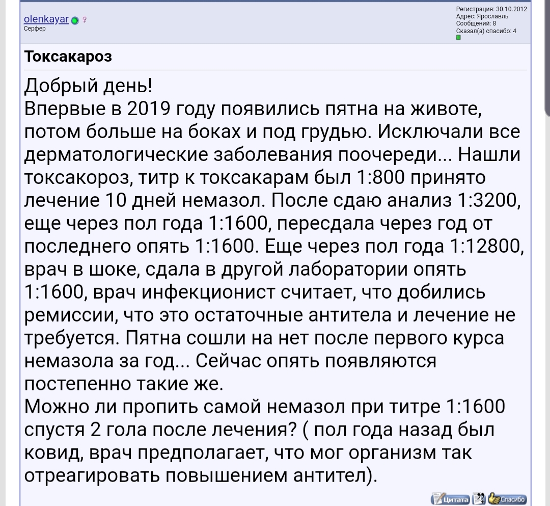 @Lexuso, и я не знаю есть ли описторхоз рыбу ела иногда соленую сушёную, красную копчёную, икру чёрную в детстве ела да и красную. Тут пишут вроде 50/50% ифа определяет описторхоз вот и думаю смысл в нём. Ну я пью 5 день фламин 3 в день +дюспаталин 3 раза в день и бифиформ 3 раза в день, пока не особа резы, сейчас тяжесть справа под ребром. Вы только урсофальк пьёте? До мебендазола, альбендазола и бильтрицида не дошла, воспалился желчный, а так хотела. На woman.ru ветка глист длинный столько всякой отравы форумчане пьют и им хоть бы что, а меня пирантел и травки от боли в пояснице конкретно вывели из строя, я прям в шоке.