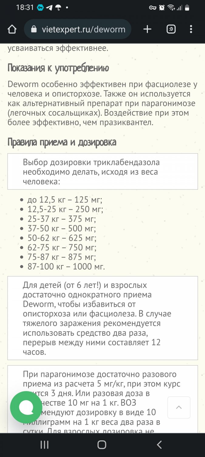 Напишу свою историю!В 2008 началось с ужасной крапивницы,отека квинке,нашли описторхоз,в 1 инфекцион.Новосиба пролечила,60мг на 10 кг веса,сделали тюбаж и домой отпустили,после зондировалась в течение 6 месяцев,было чисто,крапивница прошла!По молодости и глупости ела рыбу с пивом!5 лет после в 2013 опять крапивница, отёк квинке,стала опять бегать по врачам,прочитала про профессора Пальцева,платно пошла на прием,он меня запугал и циррозом и всем всем,суши не ела чтобы никогда,а селёдку можно, морскую можно!была подготовка с физио лечением,потом прием бильтрицида и тюбаж,потом еже съездила в санаторий Карачи и стала проходить крапивница и отеки квинке.Проходит 5 лет,опять в 2018 крапивница,не нашли описторхоз,через 8 месяцев сама прошла(но я желчегонные пила и кору осины)В 2022 осенью снова крапивница,в марте 2023 нашли описторхоз,хотя рыбу ела только морскую,суши не ела,вопрос откуда опять.Мои выводы такие,дают не ту дозировку бильтрицида,не достаточно хорошо тюбажи помогают мне,думаю надо зондирование делать после биля.Инфекционист сказала дозировка 60 мг на 10 кг,на вопрос почему не 75,как в инструкции,сказала это терапевтическая доза не такая токсичная,вот поэтому видимо мне и не помогает.15 лет мучаюсь(((решила попробовать деворм,после биля и потом кору осины пить длительно.