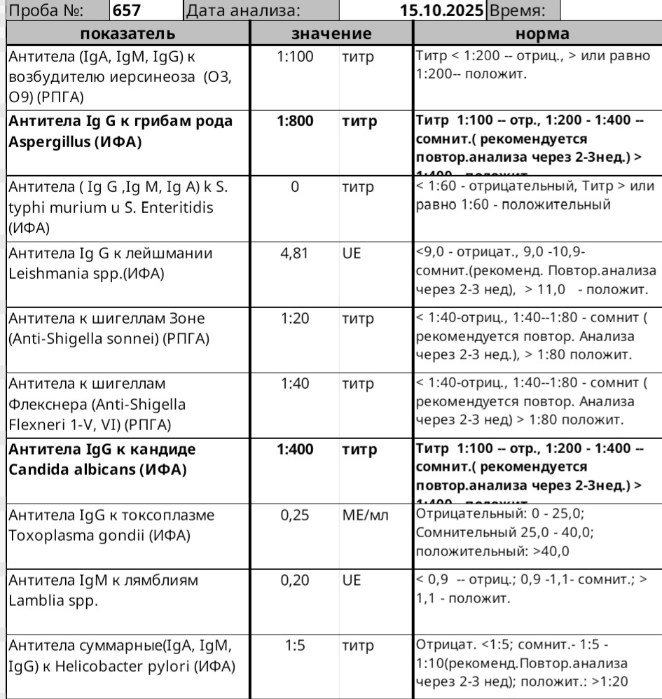 кандиды, грибы, лямблии (1:200 у вас)....