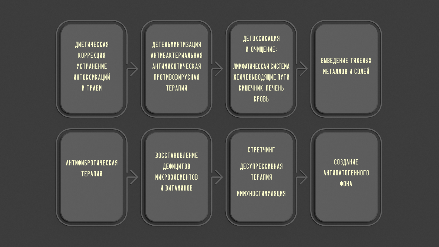 инфекция ⇒⇒ воспаление слизистых, изменение кислотности, проблемы с желчью, угнетение иммунитета ⇒⇒ фиброз, мальабсорбция, патогенная флора, пат. биоплёнки ⇒⇒ потеря микроэлементов и витаминов, увеличение грибков, повышение активности хрон. вирусов ⇒⇒ анемия, спазмы мышц, нарушение работы ц.н.с ⇒⇒ скачки давления, депрессия, тревожность, плохой сон, спазмы кишечника, запоры, ферментативные нарушения, туманность в голове, усталость, разбитость ⇒⇒ проблемы с сосудами, проблемы с суставами, проблемы с волосами, проблемы с кожей, проблемы с лимфой, проблемы с зубами, проблемы с зрением...