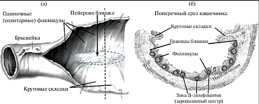 Скопления солитарных фолликулов — пейеровы бляшки (агрегированные лимфоидные узелки) — расположены в дистальном отделе тонкой и проксимальном отделе толстой кишки. Каждая пейерова бляшка состоит в среднем из 10–25 солитарных фолликулов (возможны комбинации от 20 до 400 и более).
