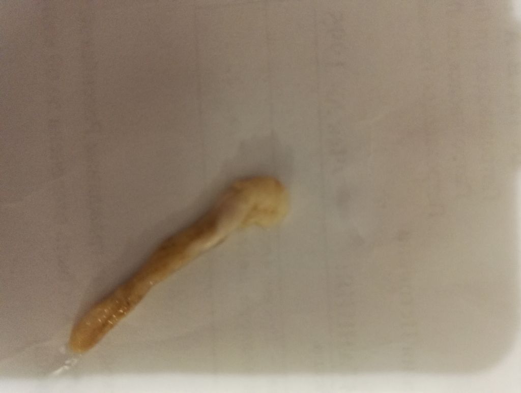 Предистория...Недавно пил триклабендазол 3,5-4-4,5-5-4 ..Во время приема желчь начинала отходить через час примерно...после препарата слабенько,но иногда тоже,через пару дней после желчегонные начал(хофитол)...В какой-то день разболелось все так...пж,жп,ну печень ладно(от биля тоже болела сильно дня три,4)...и вот дня три назад думаю дайка я посижу на полуголодной(сырой) диете и хофитол...короче натирал морковь просто...днем с магазина ел салат из капусты с уксусом....и чай зел...и так пару дней! Желчи прилично отходило в некоторые моменты.....Ну и вот вчера иду утром моюсь все норм...потом опять днем капусту уксус...значит прихожу часов в 16-прилег мин. на 40,встал иду в душ.....ну и тут начинаю мыть ....пу(извините).чувствую шарик какой-то....разворачиваю,а там это...... Встают два вопроса или это каким-то образом прогнало желчью старого жирного описторха....либо это ХВОСТ того самого,чего боялся больше всего... :D