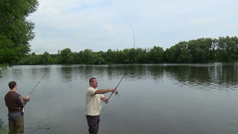 Первые забросы сделал еще на берегу, чисто для размяться. Берег мелкий, полого уходящий вдаль. Тростник кое-где, малек выпрыгивает. Поставил джиг на 8 грамм + мелкая резина. В сумме как раз около 10 грамм по низам и выходит. Заброс вполне хлесткий, недогруза не чувствуется. Метров под 35-40 улетело. Ступенька плохая выходит, мелко, приходится еще и палкой подбрасывать приманку. И вот в каком то месте, где чуть поглубже было, четкий ТЫК в руку. Подсекаю, начинаю подмотку. Что-то там трепыхается. Вывел окушка – 200 грамм. Еще пара забросов и проводок, и еще один такой же полосатик в активе. Поклевки не сильные, но передаются достаточно звонко. Народ требует не размениваться на матросов и уходить на другие места. Уходим. Идем под мотором полчаса, ставимся на якорь по эхолоту, который показывает бугры с перепадами от 3 до 7 метров, и кучу всякой всячины подводной. Катер большой, начинаем втроем джиговать во все стороны со всех бортов. Первые пол часа какие то невнятные тычки, рыба не засекается. Потом потихоньку расклевался всё тот же 200 граммовый окунь. Вес ушастика уже 15-18 грамм, твистеры 3’’ цвета моторное масло. Ступенька уже четкая, с хорошим контактом на твердом дне. Видно и по хлысту, и в руку постукивает. В итоге, простояв на этом месте почти час, каждый взял в среднем окуней по 10-15. У меня самый толстый был на 580 грамм. Ударил так, вернее палка передала поклевку, что думал судачина сел. Ан нет, просто хороший окунь. На окунях, считаю, вполне палочка обкаталась. Наглею, требую на судака везти меня, мол, хватит мелочь ловить. Переход на новую точку. Глубины уже серьезные, от 8 до 12 метров, свалы по руслу, и заметное течение. В ход пошли виброхвост Samba MANNS 8 сантиметровый и ушастик на 22 грамм, который потом спокойно поменял на 26 грамм, ибо ветер поднялся, и снасть немного парусить стало. Вся ступенчатая проводка четко в руку, на хлыст уже и смотреть почти перестал. Судак на 2-шник всё-таки клюнул. Поклевка была очень слабая, краешком почти губы засекся. Но спиннинг уверенно вывел его до катера, не дав сойти. Т.е. бланк работал на вываживании весь, плавно гася рывки рыбы уйти в сторону или сорваться. С этой точки больше никто рыбы не снял, и решили уйти под берег по щуке попробовать. Встали напротив тростника, стали воблерами и колеблом кидаться. Я поставил каст-мастер на 20 грамм, голимый китайский, но с хорошими крючками. Ловил практически тем же джигом. Блесна упала на дно, подмотка, пауза и так далее. Заброса с пятого зацеп там, где только что проводку делал. Бывает такое, что кидаешь, кидаешь, и на очередном забросе снимаешь с этого места ветку какую-нибудь, или пакет с песком и мусором. Подумал, что и сейчас буду дно очищать от грязи. Палку поднапряг, стал выкачивать мусор. На втором качке мусор поплыл в мою сторону и очень активно так поплыл! А потом такие рывки пошли, что сомнений не осталось – взяла щука и не мелкая. Водил её минут 15, наверное. То, я её, то она у меня отмотает плетни. Всё за палку боялся, палка колесом, фрикцион, ослабленный ниже теста лески визжит. Еле в подсак завели, голубушку. Весы дали цифру 5 600. После этой щуки все опасения по поводу спиннинга отпали сами собой. Оправдался по полной и в плане силового заброса, и по чувствительности, и на вываживании. Жду теперь очередных вылазок за трофеями и очередного поступления финансов на приобретение данного дева