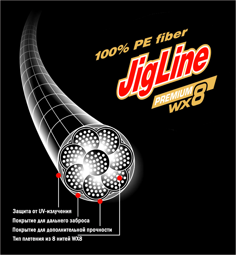 Шнуры серии JigLine производятся из особо прочных РЕ нитей c разрывной нагрузкой 30 гр/денье. Волокна из высокомодульного PE получаются путем специального формования и последующего охлаждения, что позволяет производить гелеобразные нити с высоким содержанием слоистых кристаллов.