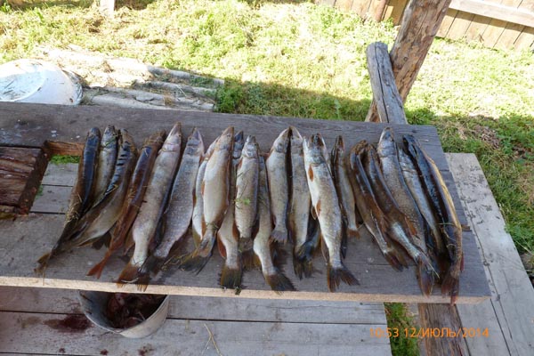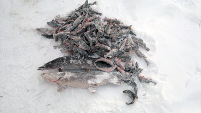 Окунь ловился в основном размера 100-200 грамм, иногда 300. В озере есть так же и крупный окунь (летом обыкновенно ловится 300-500 грамм), но это был видимо не его день. Есть крупный чебак, но зимой он ловится плохо, а по последнему льду говорят ловятся экземпляры по 300-400 грамм. Есть и не мало щуки. Щуки вся как на подбор 2-3-4 кг. Две зубастых поймали на жерлицы. было еще несколько поклевок на блесны и балансиры. Вся рыба крупная, то плохо засекается, то ошибешься при вываживании и сход, были и обрывы.