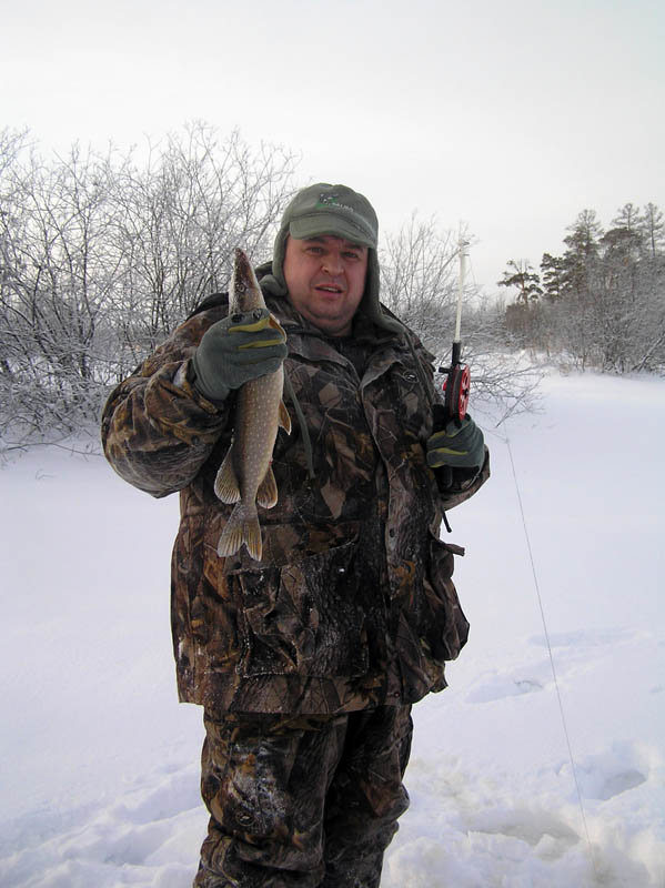 Целью поездки была разведка, а не добыча рыбы. А потому за полтора часа поймав примерно 30-40 окуней, мы стали собираться домой. Было очень холодно, и не из-за мороза, а из-за холодного ветра. НА фото это не передашь, но на воздухе все замерзало моментально. 5-10 минут и окунь уже превращался в камень. И что самое обидное - рыба клевала только там, где дул ветер, а за лесом, где было тихо, клева не было. Ближе к обеду клюнул чебак. Рыбка эта любит тепло. А в холодные дни клюет только днем.
