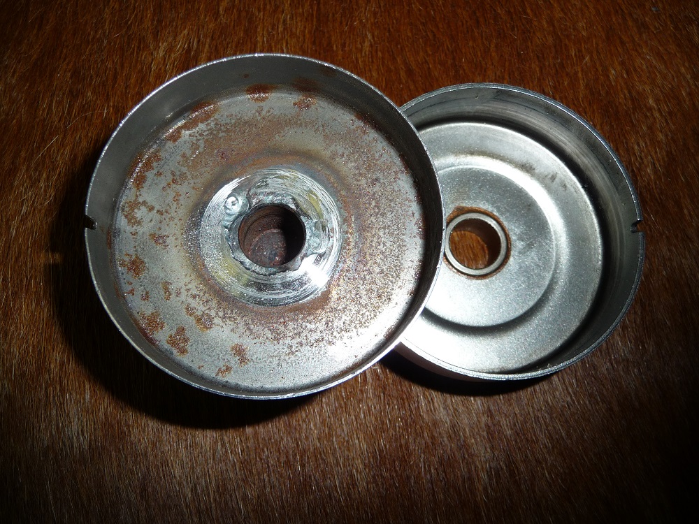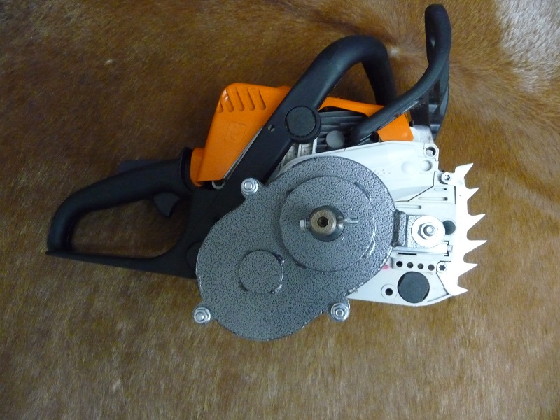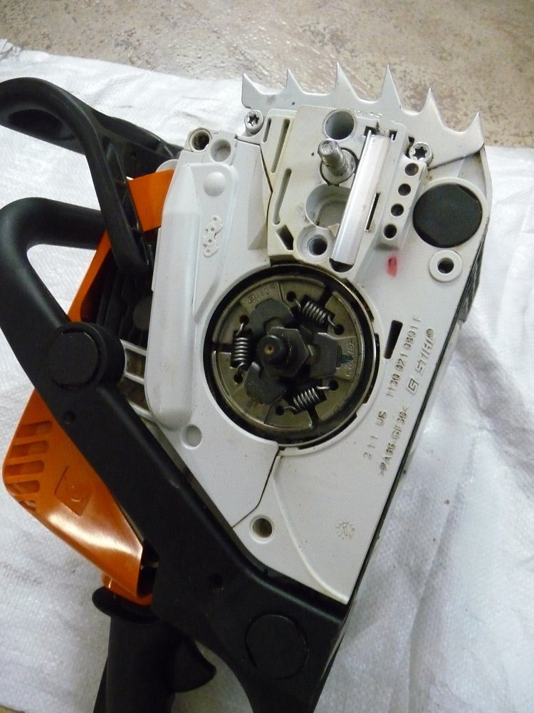 Кажись нашел, ведомый диск снят, сцепление не выступает за корпус пилы. А на другом фото родной ведомый диск и диск от одного из редукторов, приводные звезды ес-но не видно, они внизу. Других фоток к сожалению нет.