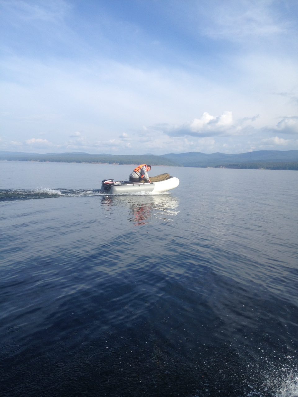 На моторе Тохацу 9.8, с загрузкой рыболовными снастями, лодка шла спокойно 33 км/ч против достаточно серьезного ветра. Так же из интересных экспериментов, это возвращение из залива Сисим с пересечением Красноярского моря в поселок Приморск. От бухты, в которой мы прятались от непогоды, до Приморска 11км. Волна не позволяла выйти гружёной лодке на моторе в 5 л.с. в глиссер. Поэтому было решено поставить на мою СВ300 мотор Тохацу 9.8 и уложить малую часть нашего груза, около 40 кг. Остальную, большую часть груза сгрузить в Солар 350 (килевой), поставить на него мою пятерку и прицепить сзади за моей лодкой на фал. Таким образом я выходил в глиссер сам и вытягивал в него груженную лодку, идущую под мотором 5 л.с. Это помогла беспроблемно преодолеть неспокойное Красноярское море со стабильной скоростью 19 км/ч.