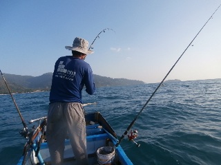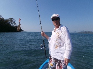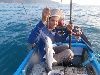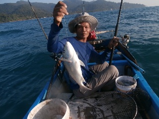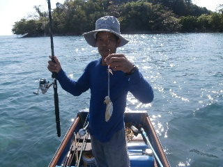 image.jpgНаконец-то я выцепил этого неуловимого аборигена-рыбачка на лодке с моторчиком. Сначала ловили кальмаров под островом и довольно неплохо, потом, уже под вечер, между берегом и островами на этого же кальмара, рыбку. Большую я не поймал, а товарищ-абориген вытащил пять штук, все далеко за килограмм. Но я теперь знаю, как надА ловить. Немного поменяю оснастку и завтра мы снова идем.