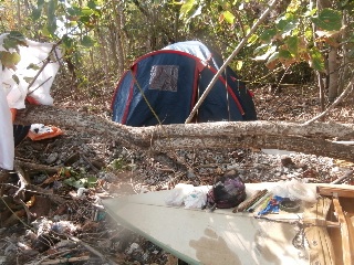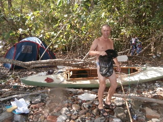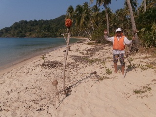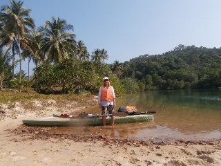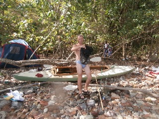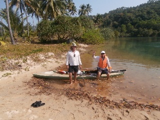 В обед пятого января вышли с пляжа Клонг Прао и взяли курс на Банг Бао и к восемнадцати часам прибыли в район пристани. Чтобы не обходить выдающийся мыс (два лишних километра) перетащили байдарку и вещи через узкий перешеек, поставили палатку и пошли на пирс поужинать и пополнить баланс телефона. Огромный пирс с массой магазинчиков, кафешек и прочих забегаловок от которого отходят шхуны на все острова этой части архипелага. Утром в восемь часов под пристальными взглядами китайцев и прочей неруси выдвигаемся дальше по восточному побережью Чанга. После часа хода небольшой привальчик на диком пляже. Кто бывал на диких пляжах островов Тая, тот знает, что там творится. Десятилетия воды Сиамского залива выплескивали на берег то, что было смыто или выброшено за борт - пенопласт, огромный ассортимент сланцев, чашки, ложки, пузырьки, пластиковые бутылки, зажигалки и прочее. Сам берег чистый, все это за зоной прибоя. Придет время, надеюсь, когда все это будет убрано, но ждать придется долго. Следующий привал после часового перехода в живописной лагуне с чистейшим берегом, прозрачнейшей водой и впадающей неспешной речушкой с пресной водой. На берегу кокосовая плантация и две палатки. В одной живет бородатый одиночка таец с копной волос на голове, хозяев второй палатки не видно. Купаемся, загораем, отдыхаем. При заходе в воду спугнули косяк крупной рыбы, но рыбачить некогда. Пожалуй, это самое класс ное место на Чанге, берем на заметку и идем дальше. Два часа хода и мы в другой лагуне нашпигованной островками. Выбираем один из них, на нашей карте без названия, с песчаным пляжем и, как выяснилось позже, с заброшенным отелем.