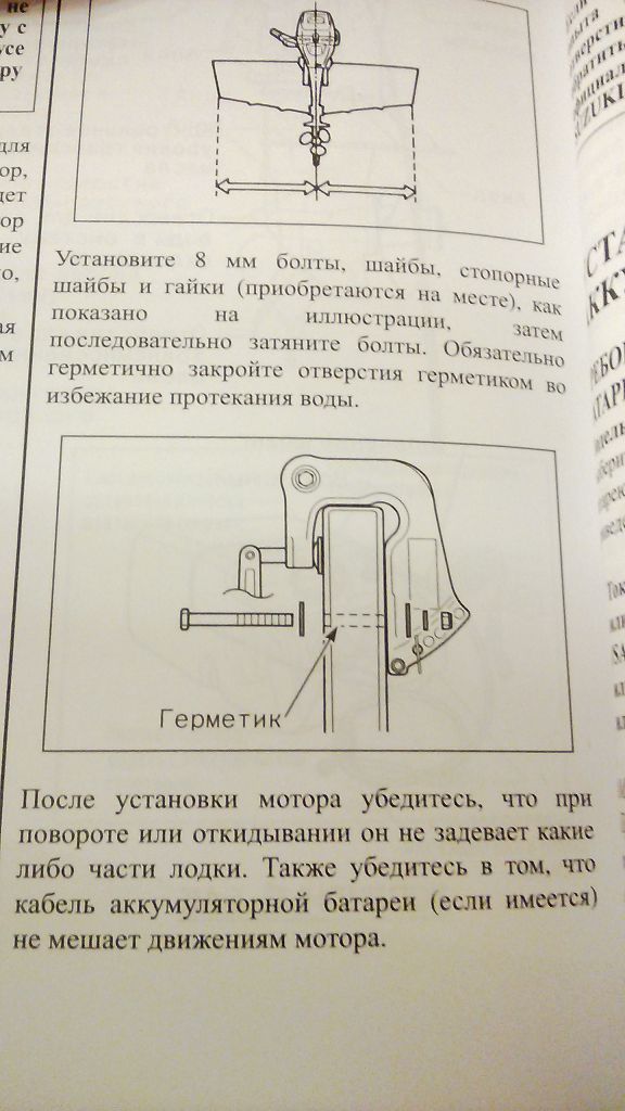 Еще в паспорте написано ,что нужно сверлить какие то отверстия под болты в транце? Если вы не умеете то обратитесь к сервису suzukl. Что за отверстия. На маторе есть уже уши под винты примерно d10. Я работал в Газпроме на Оке и ходили на YAMAHA 15 сил примерно. Так там никаких дырок не сверлили. И мотор за день не откручивался. Вообще что мне нужно бояться. И как предотвратить это? Буй нужно покупать, к мотору привязывать? Или просто прикрутил и пошёл гулять по водоему