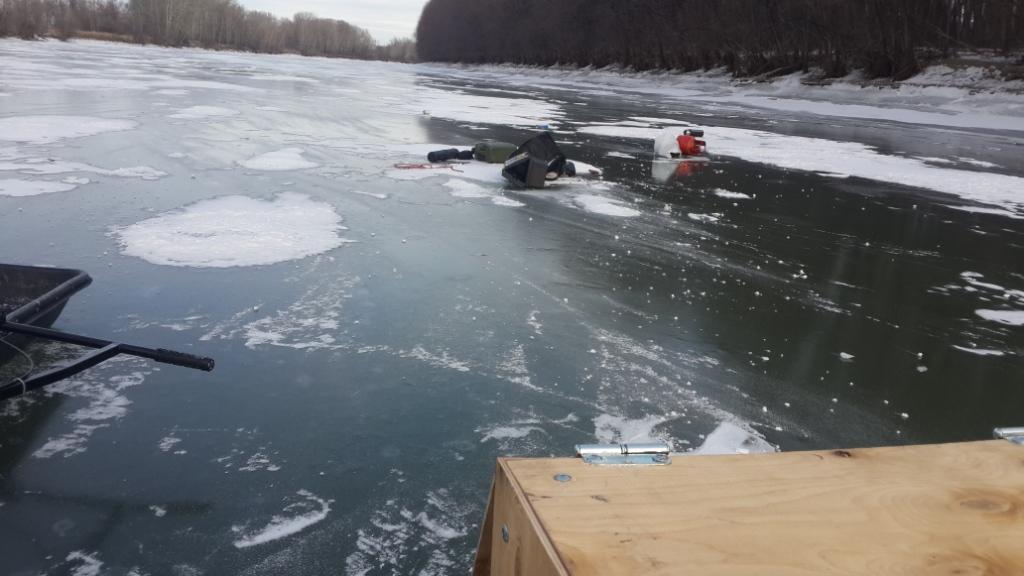 В санях ледобур валялся без чехла , а из рундука мимо пролетели канистра с десяткой бенза , топор ,баллон 5 литровый , полный (термоса и ящики с инструментами , это мелкашка ) . Будто меня взял кинг конг , вместе со скарбом потряс в стакане и швырнул на лёд . Но лоховская удача была на моей стороне , сильно только ногу ударило рулём , да половинку тубуса не смог найти ( вот как не найти чёрный большой тубус , на льду , в солнечный полдень … ) ветром подхватило и унесло . Катался по протоке минут 20 , так и не нашёл .