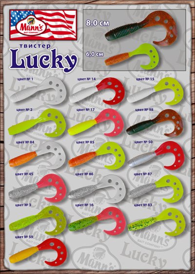 Совсем недавно поступила партия твистеров Lucky торговой марки Manns. Эти твистры имеют большую хвостовую лопасть, создающую интенсивные колебания при проводке в воде, и отлично работают в фазе свободного падения. Lucky предназначен для ловли хищника на водоемах без течения или в заливах рек. У этой модели хвост перфорированный.