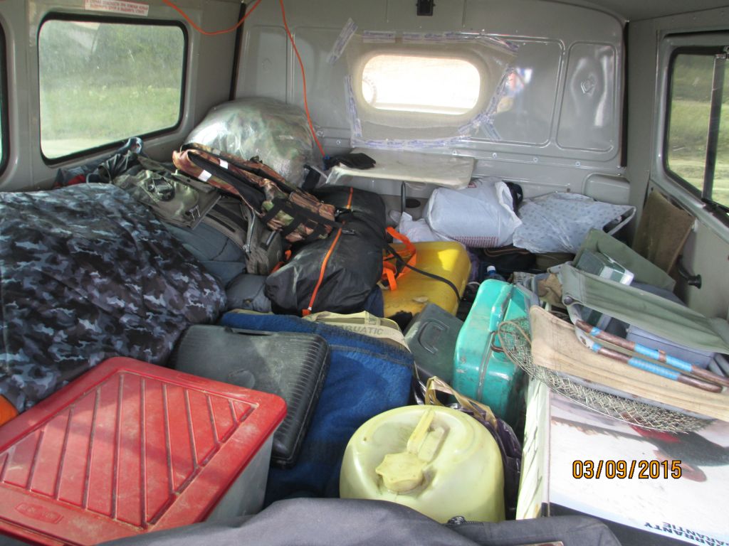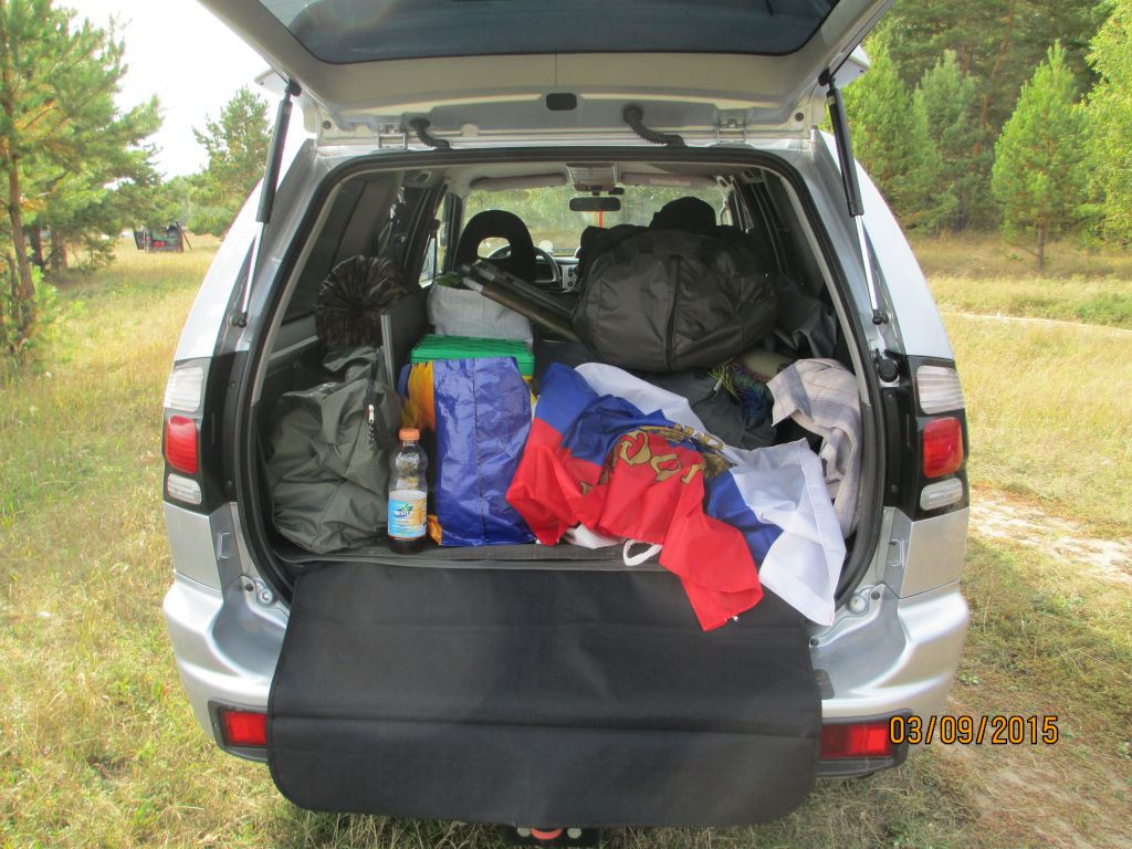 На верхней части помещается лодка Солар 350 с лавкой, шатер 4*3, стол, два стула, тубус, ящичек с тремя катушками, эхолот с акумом в ящике, рюкзак с приманками, газовая плита, рюкзак с вещами, два спальника и два спас-жилета. Салон обычно свободен, но бывает на заднем сиденье стоит большой пластиковый ящик под продукты и улов и морозильник на 40 литров, в который одновременно помещается три щуки от 4 до 6 кг, несколько судаков по 2-3 кг и с десяток стерлядок.