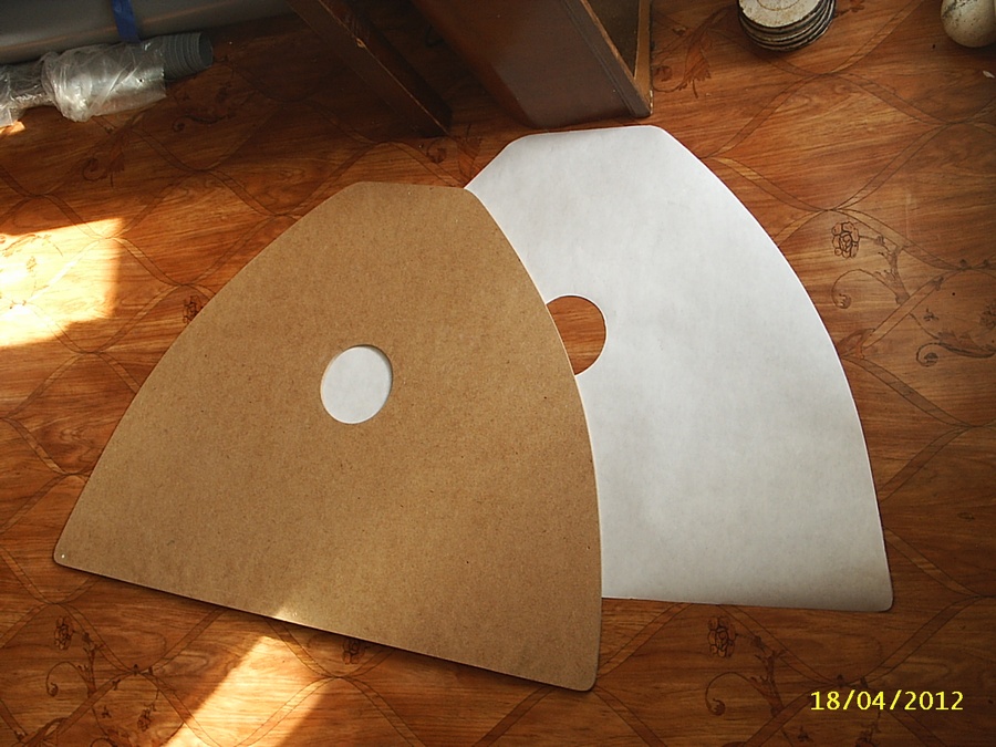 Затем аккуратно вырезаем ножницами и накладываем на тонкую фанеру или твердый оргалит. Обводим карандашом и вырезаем оставляя черту. Деревянным бруском обернутым наждачной бумагой удаляем излишки, шлифуя до разметки карандашом. Мы используем для шаблонов твердый оргалит т.к он обрабатываеться легче фанеры и подгонку можно сделать очень точно.