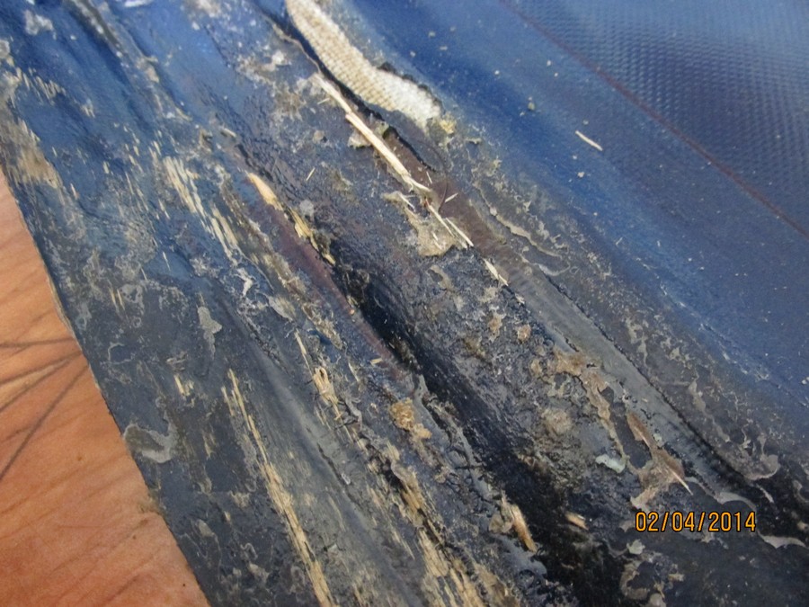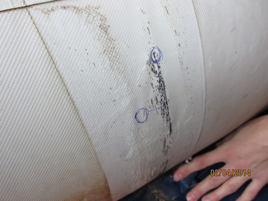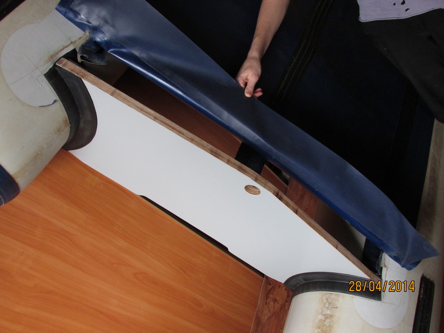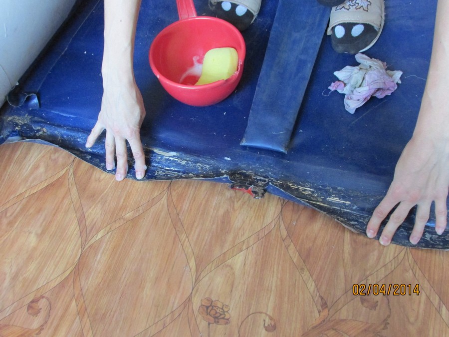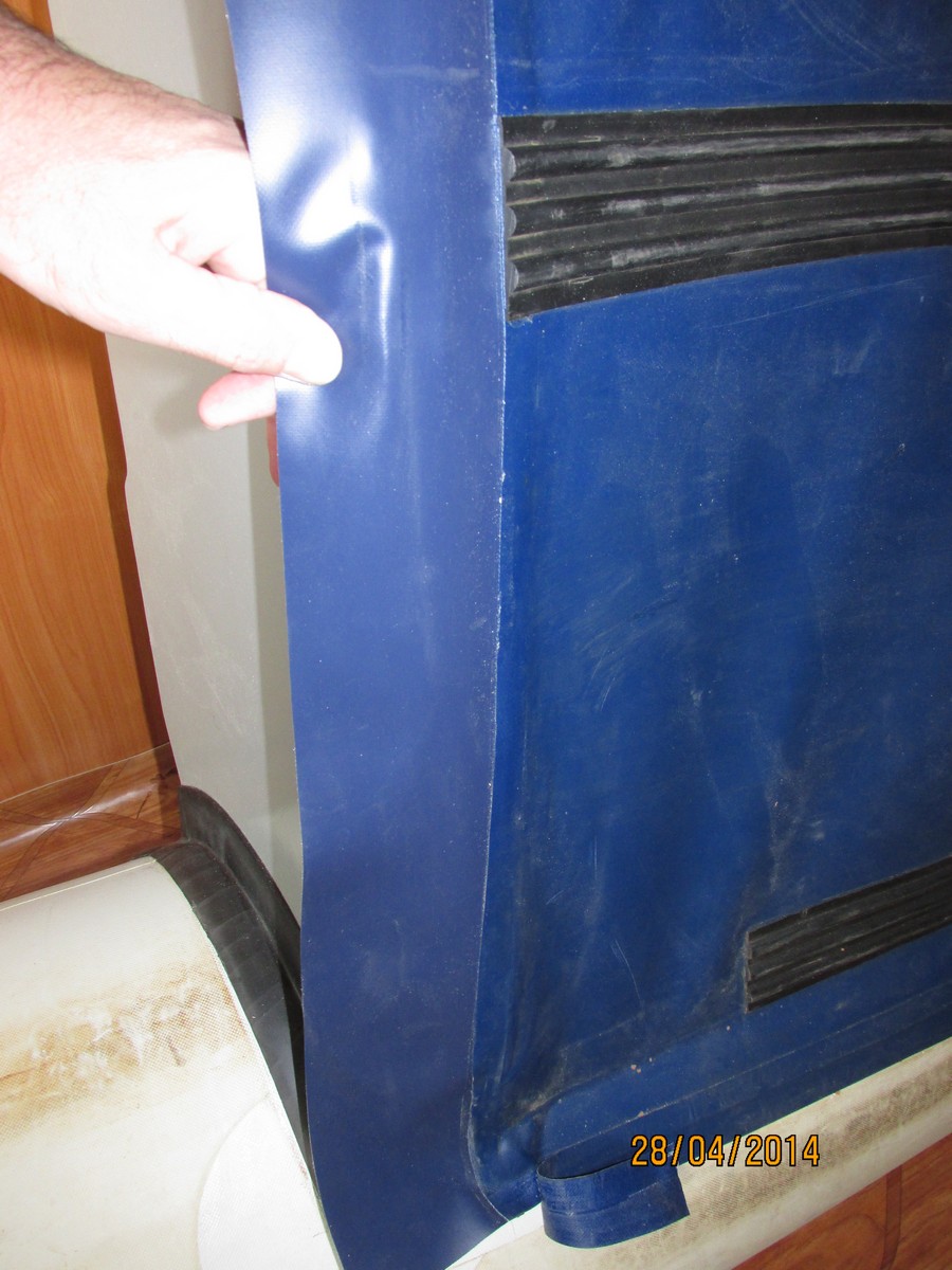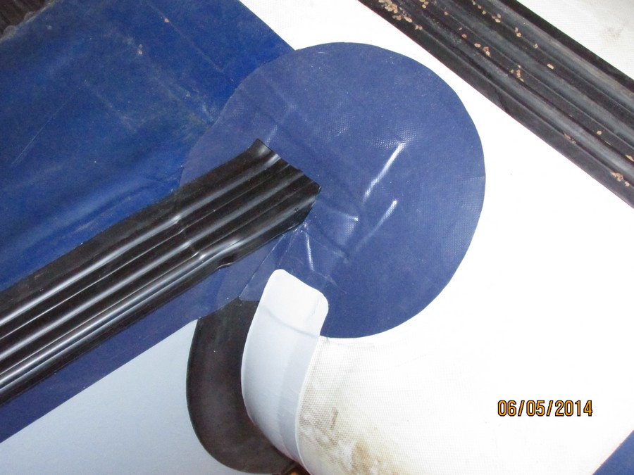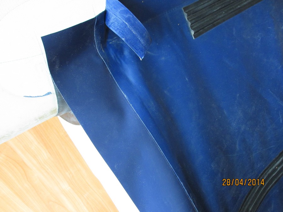Мы приняли решение вырезать испорченный кусок днища и вклеить на его место ленту синего ПВХ плотностью 1050 гр. м.кв.