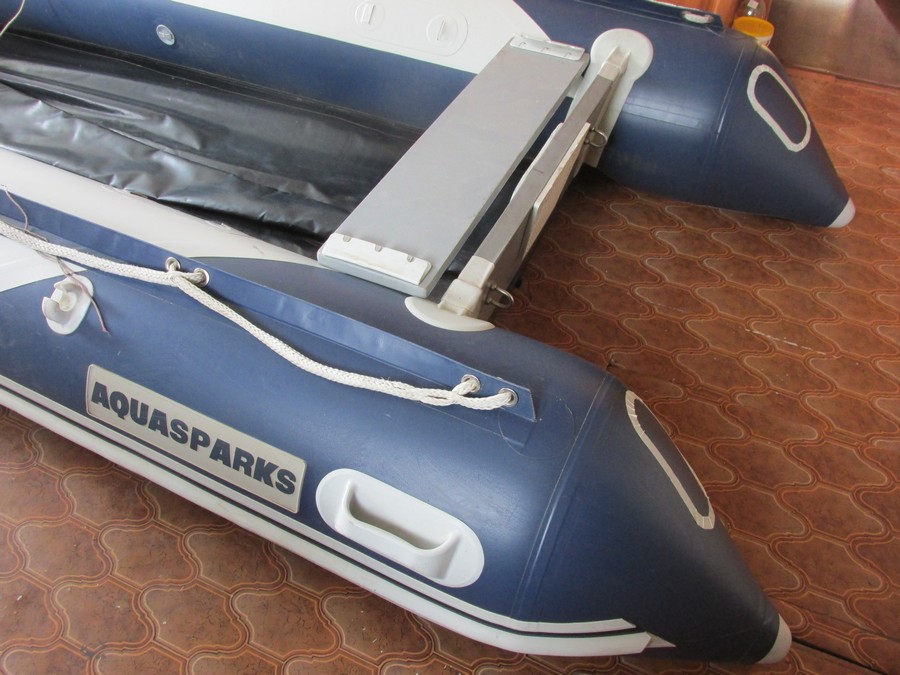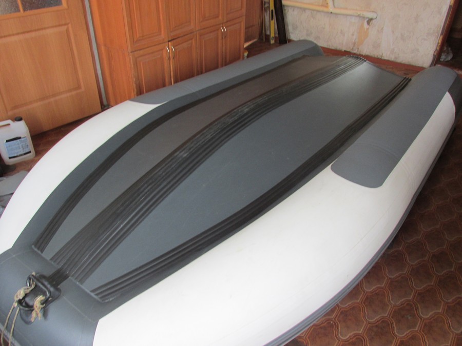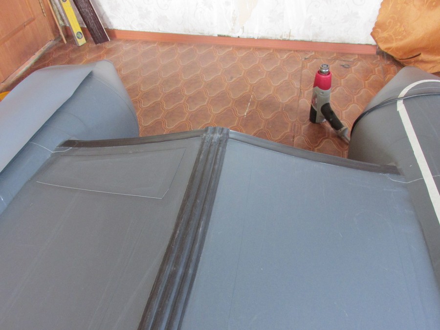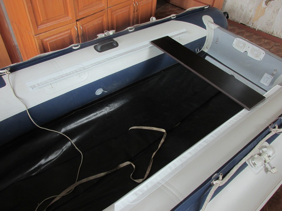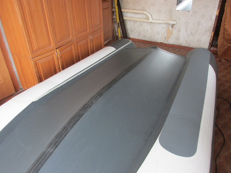 Через 12 часов устанавливаем пайолы и надув лодку ставим заплату с наружней стороны днища