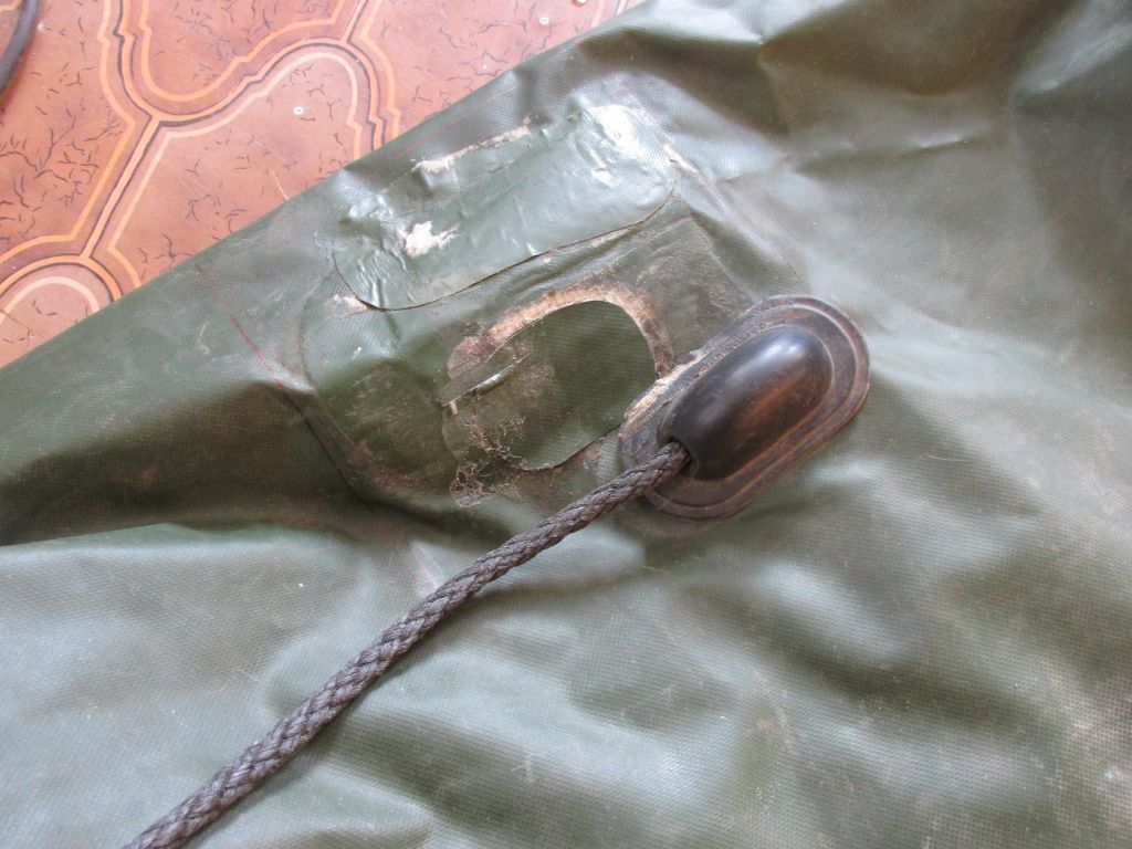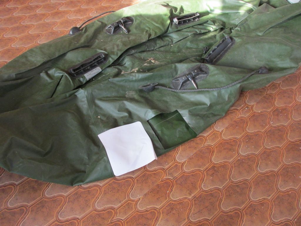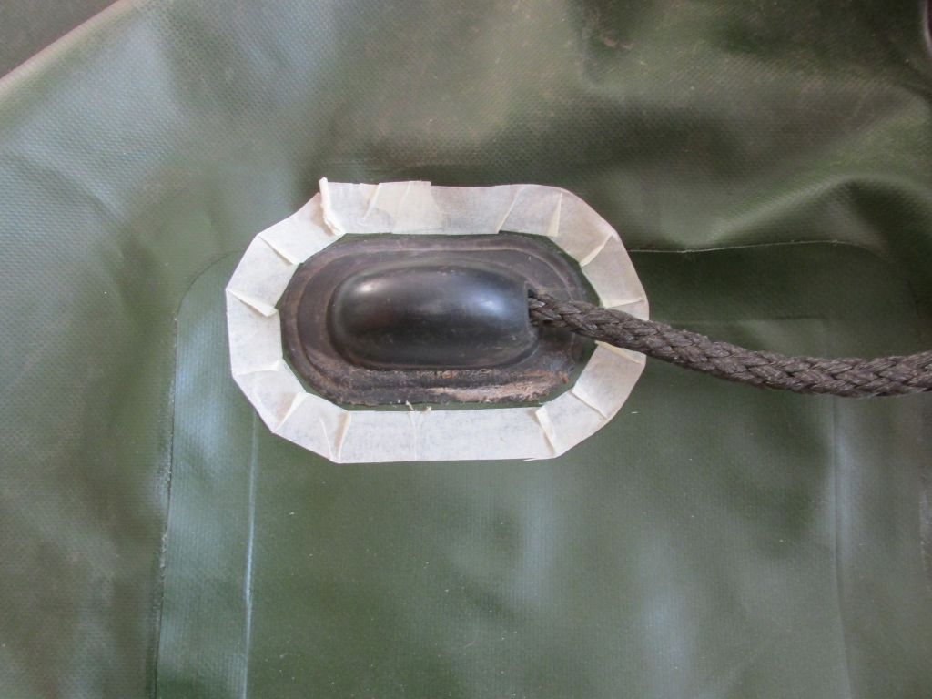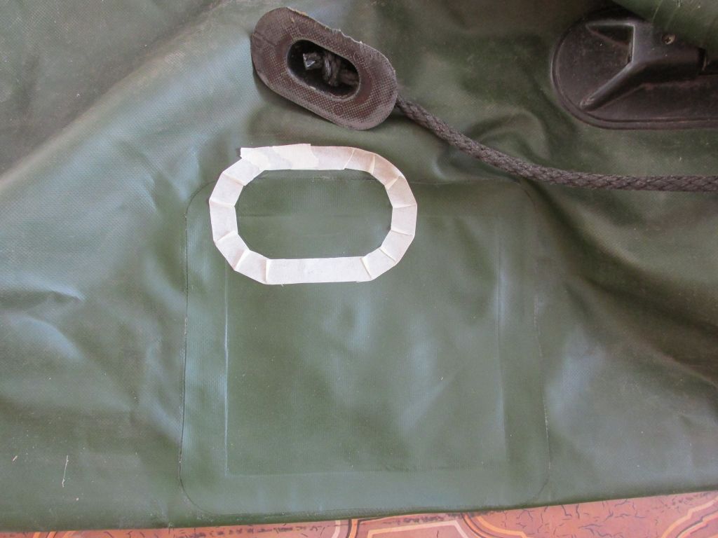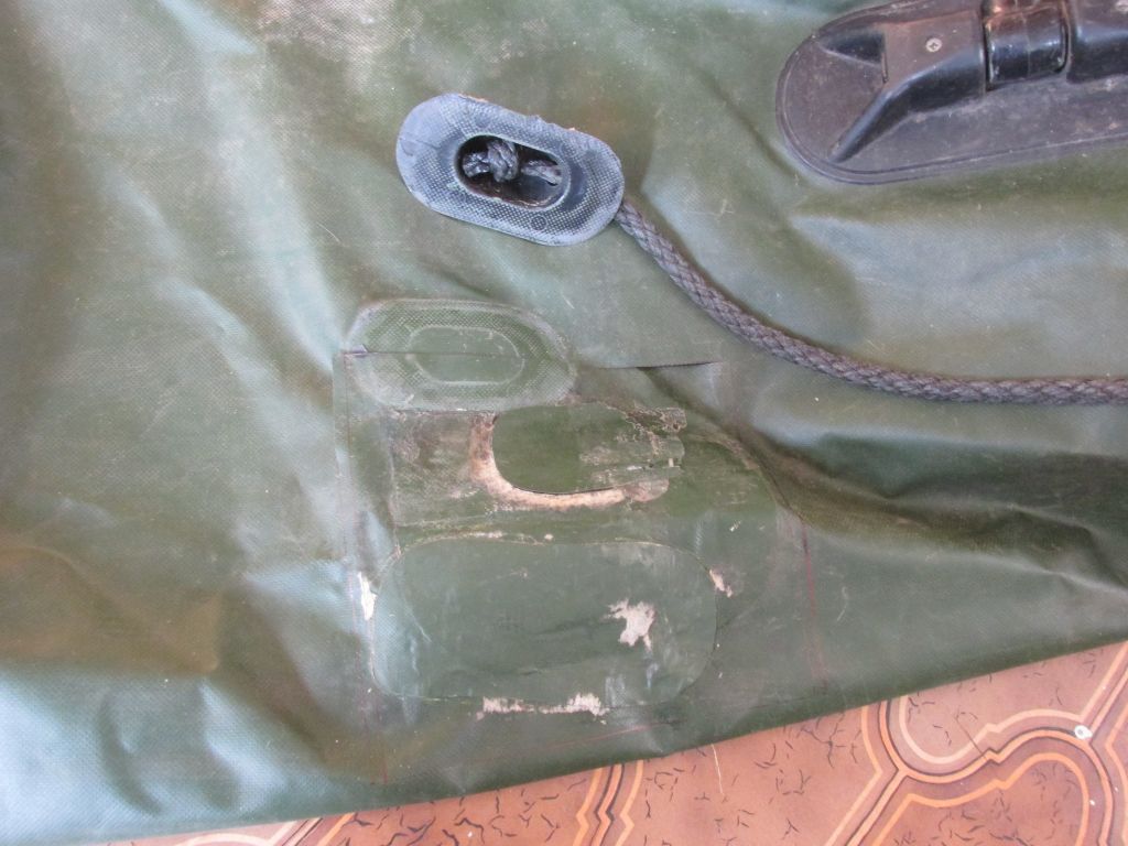 Через сутки мы надули баллоны и установили наружнюю заплатку. Так же мы приклеили назад рым предварительно оклеив скотчем контур.