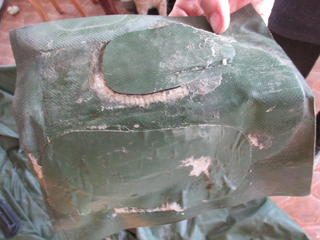 Недавно нам привезли в ремонт лодку. Хозяин пытался самостоятельно устранить небольшие повреждния на баллоне. Но после наложения нескольких заплаток травления не исчезли. Осмотрев баллон мы увидели, что поверхность ПВх испорчена. Нам пришлось вырезать из борта кусок 30 на 30см. Так же пришлось демонтировать рым. Сначала мы установили внутренюю заплатку с перекрывом в 2см